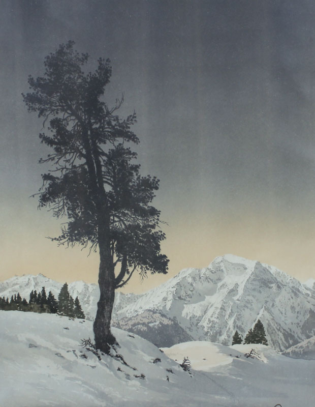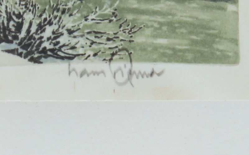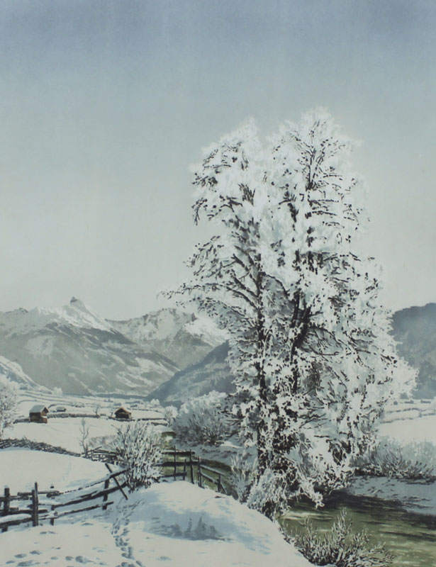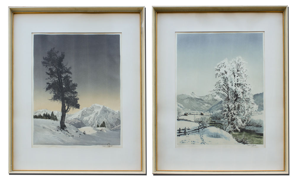 FIGURA, Hans, (Austrian, 1898-1978): Pair of Winter Scene Etchings on Silk, sight size 18'' x 14 1/2'', pencil signed and framed, 26'' x 21 3/4''.