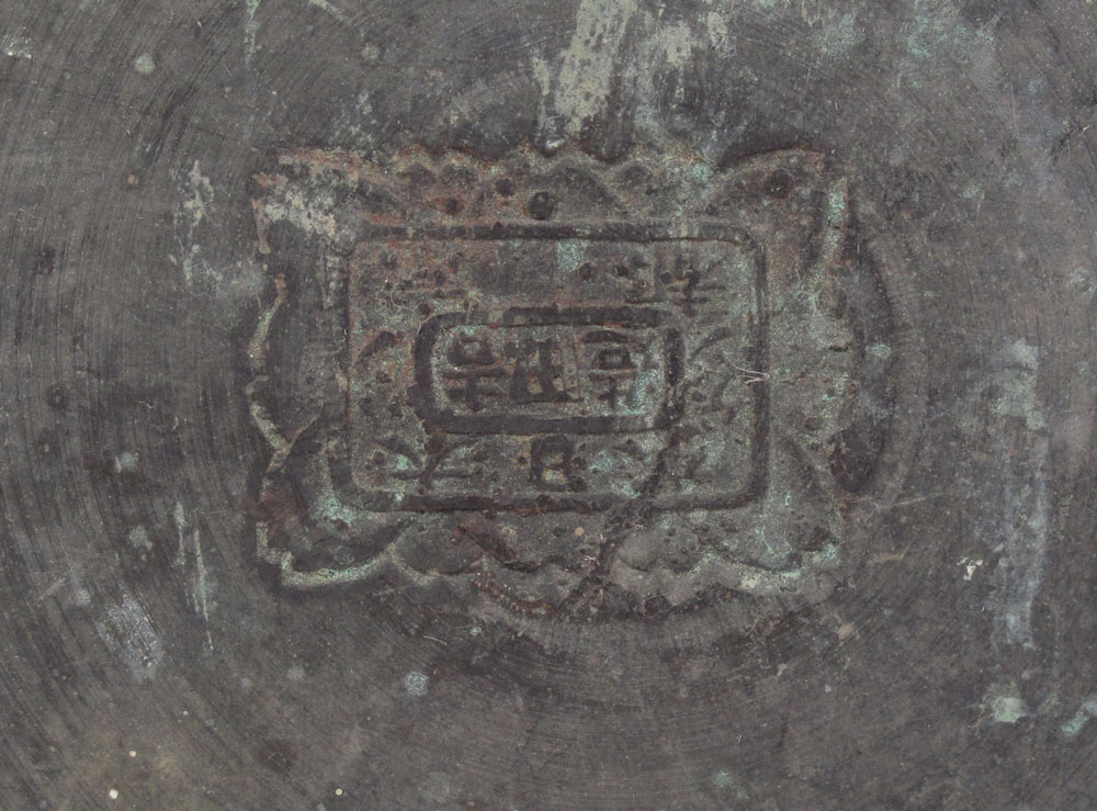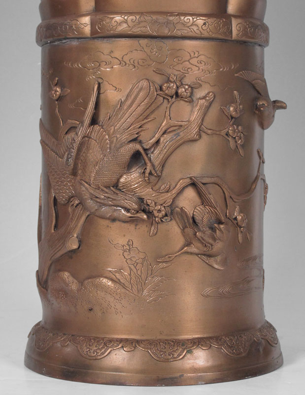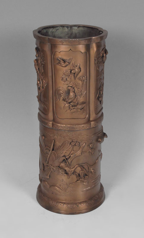 JAPANESE BRONZE UMBRELLA STAND: Tall lobed form deeply embossed bird decorated panels. 23 3/4'' tall x 12'' dia. Harvey Hanaford Miller/Charles Wiedemann Collection.
