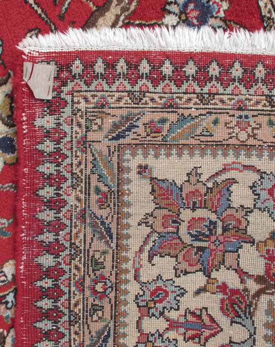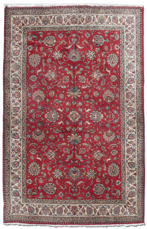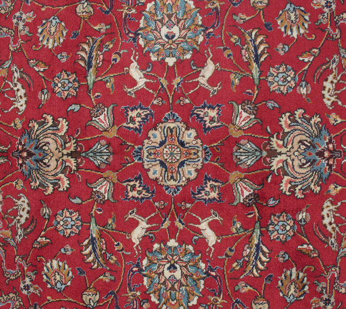MODERN HAND KNOTTED WOOL INDO PERSIAN RUG, 7' 4'' x 11': This pretty carpet has a red ground in the main field that is covered with palmettes and flowerheads linked by vines in a curvilinear design. There are birds, deer and antelopes scattered throughout the field. The ivory ground main border completes the picture of this attractive rug. Condition is very good.