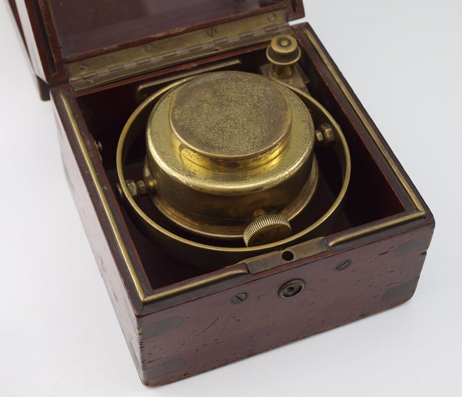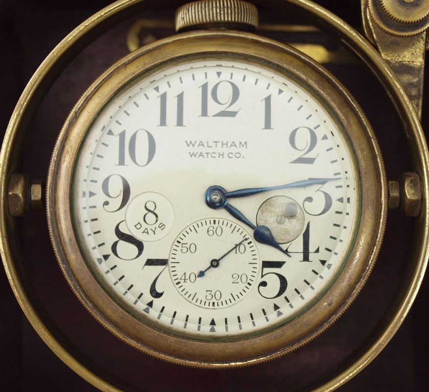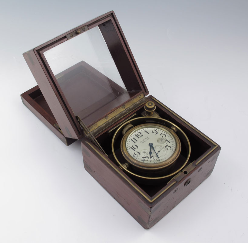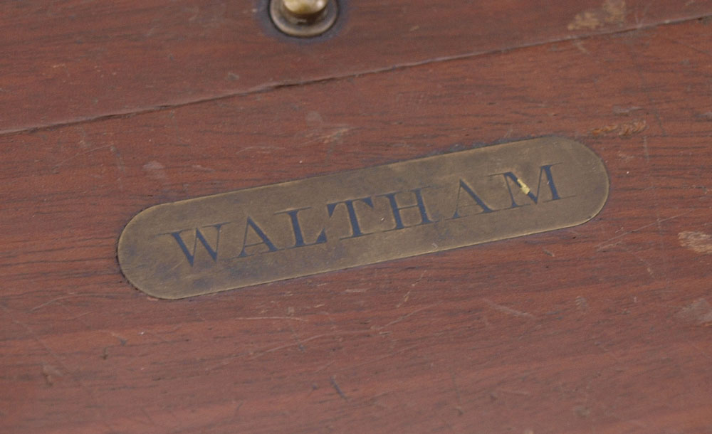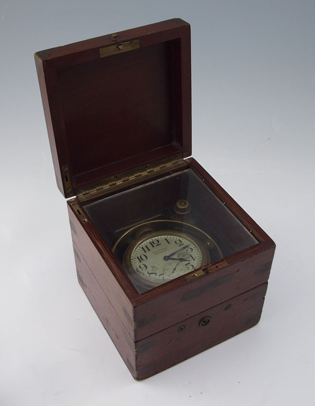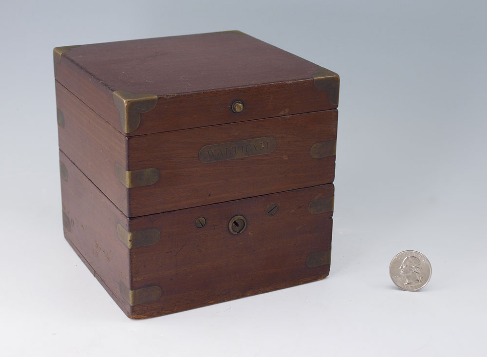WALTHAM CASED MARINE CHRONOMETER: Double hinged lid with interior lid having glass top. Mahogany case with brass accents, Waltham plaque on front. Pocket watch style wind movement. Face marked Waltham Watch Co., mounted on gimbaled mount. Measures 5'' h. x 5'' x 5''.