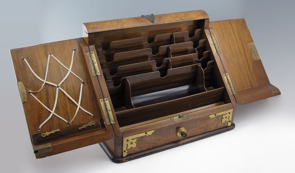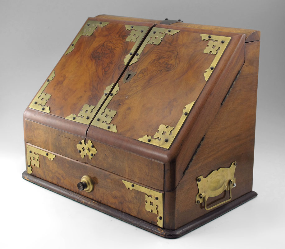 19TH CENTURY BURL WOOD DOCUMENT CASE: Burl veneer case with brass accents and hardware. Doors open to reveal 4 slats, pen tray. Single drawer. 11 1/4'' h. x 14 1/2'' x 6''.