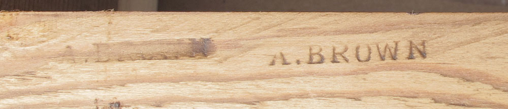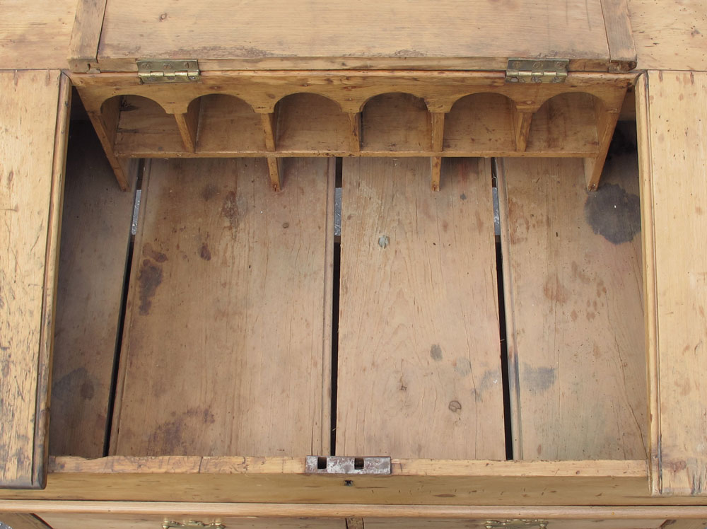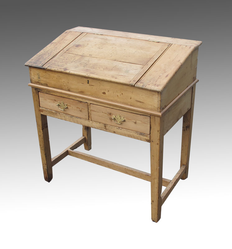 ANTIQUE PINE LIFT TOP TEACHERS DESK LECTURN: Slanted writing surface raises to reveal cubbied storage space, over two drawers with replacement brass pulls, slightly tapered legs with cross stretcher, dovetail and peg construction. 40 1/4''h. at back, 36''h. at front, 37''w. x 23''d.