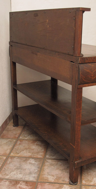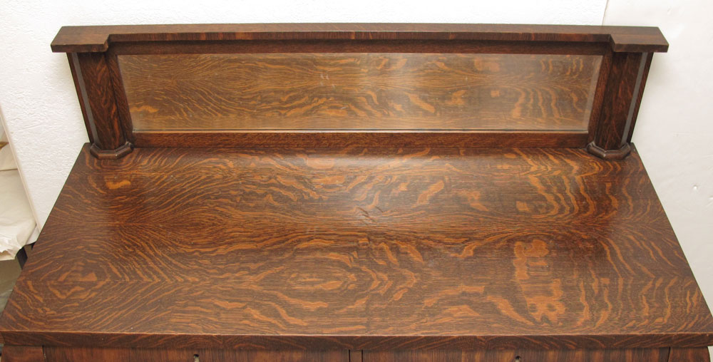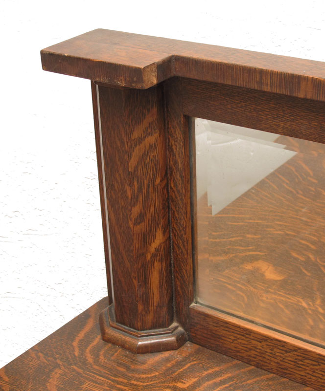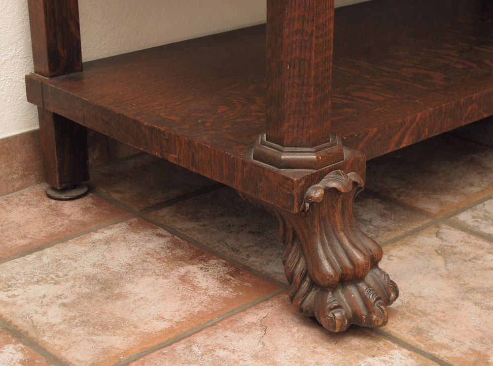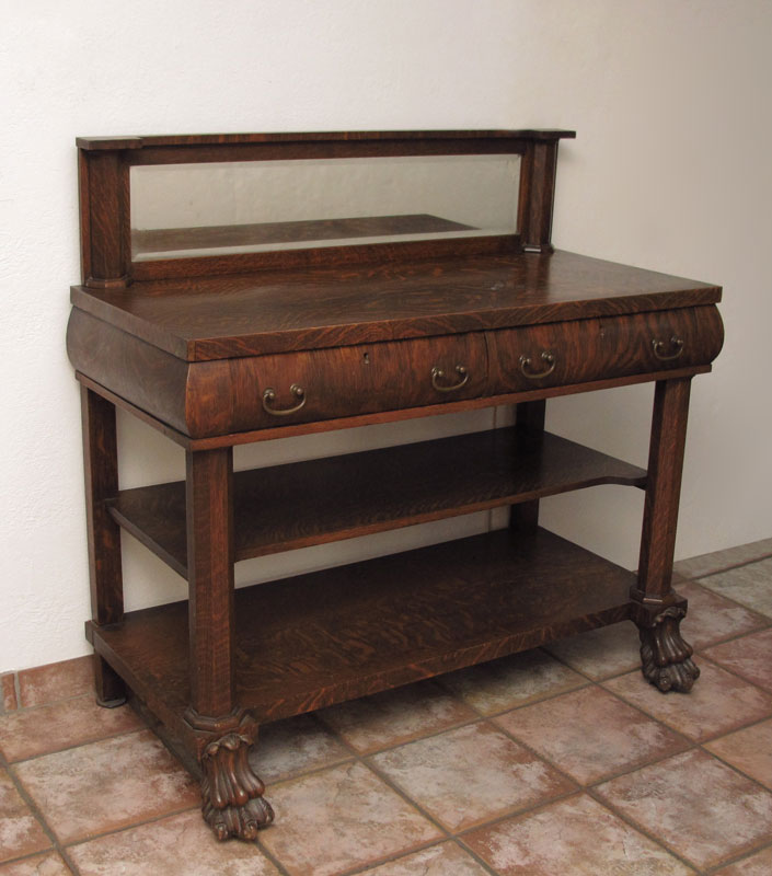 LATE VICTORIAN ERA TIGER OAK PAW FOOT SIDEBOARD: Mirror backsplash, two half length drawers over open shelves. 45 1/2'' h. x 47 1/2'' x 22 1/2''.