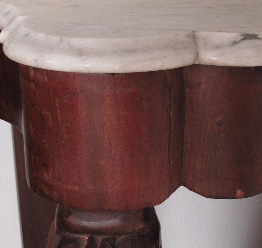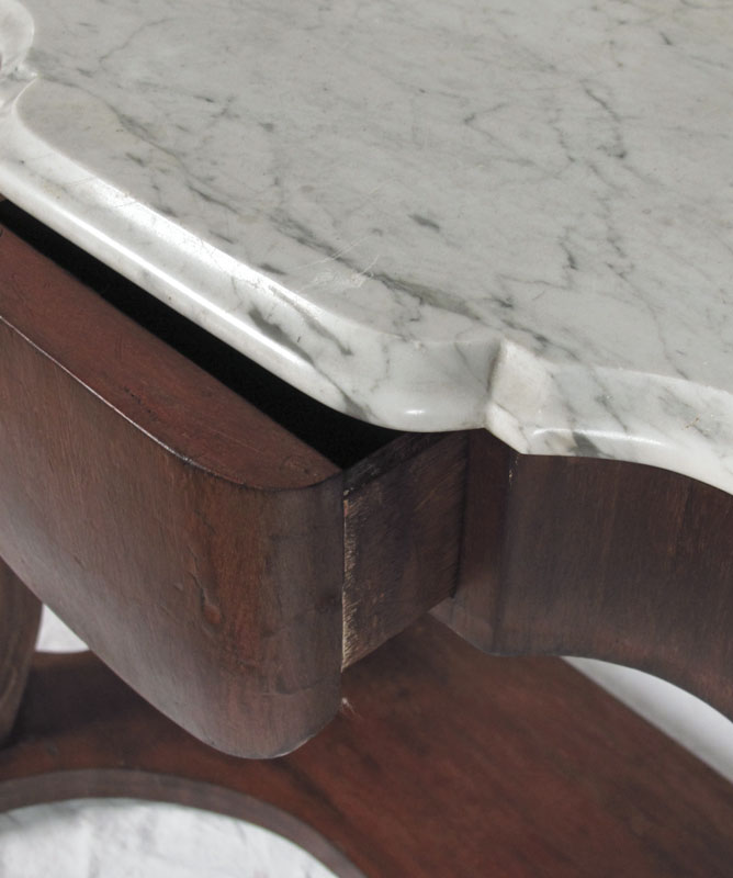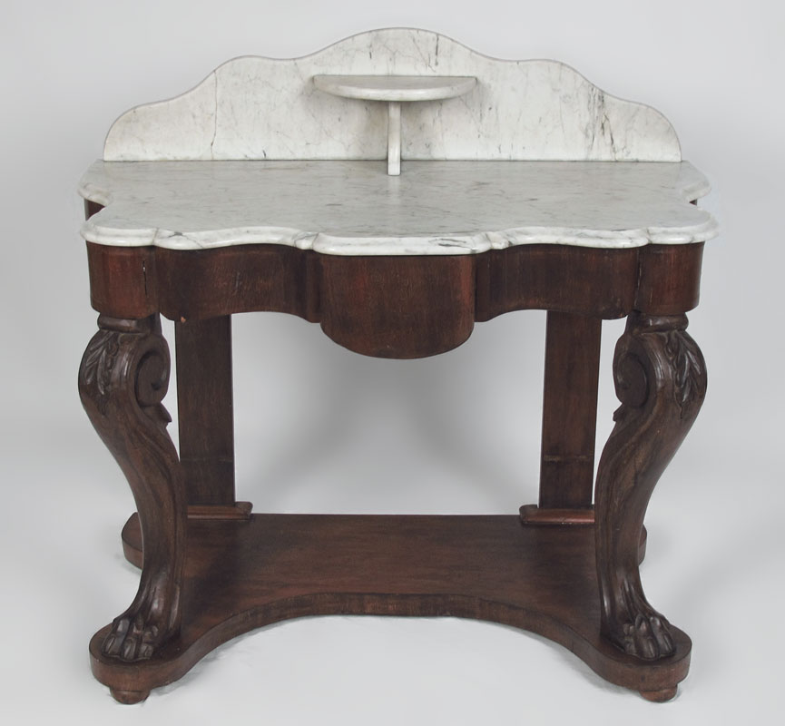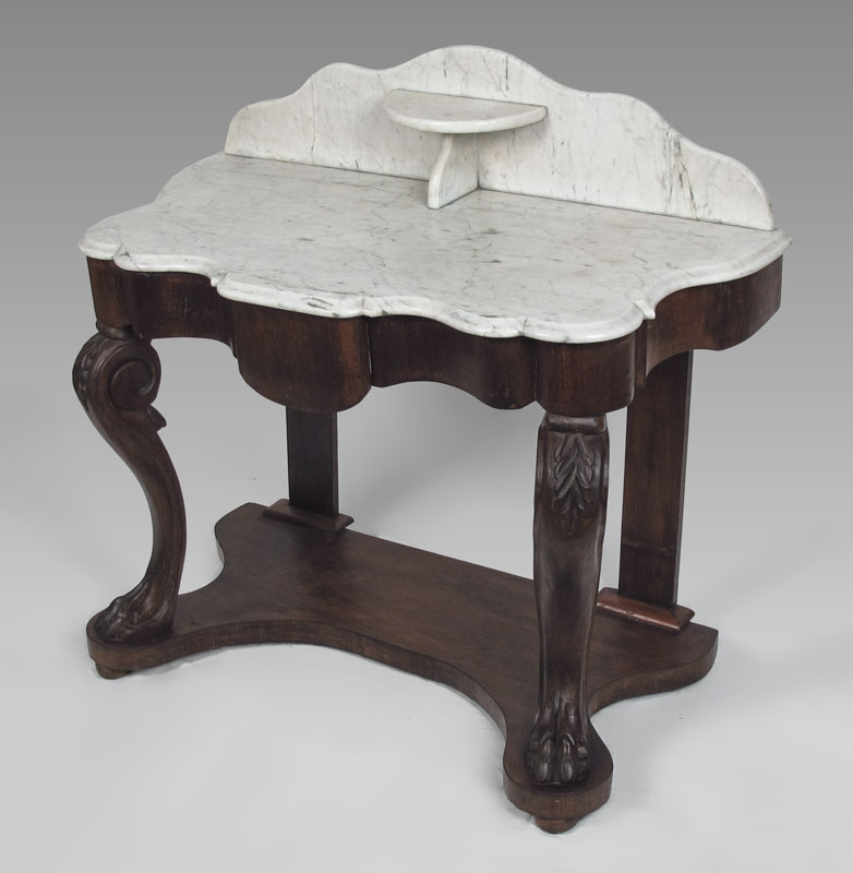 MARBLE TOP VICTORIAN TABLE: Shaped white marble top and backsplash over single center drawer. Carved and shaped front supports ending in paw feet, lower base shelf. 36'' h. x 21'' x 40 1/2''.