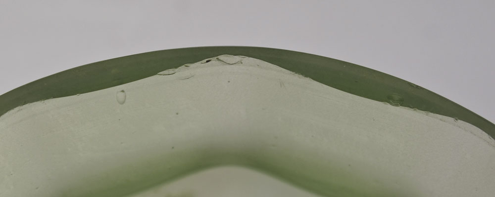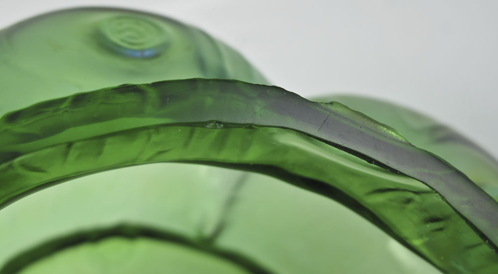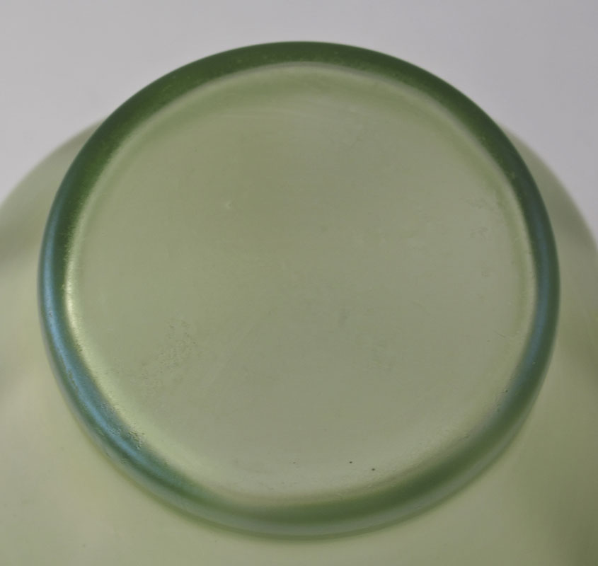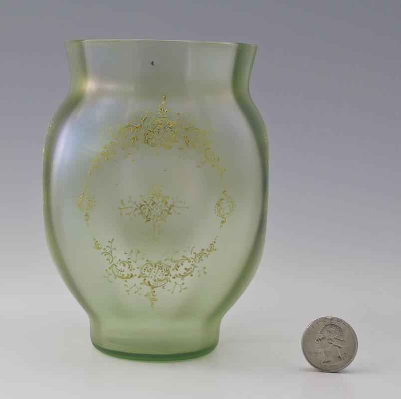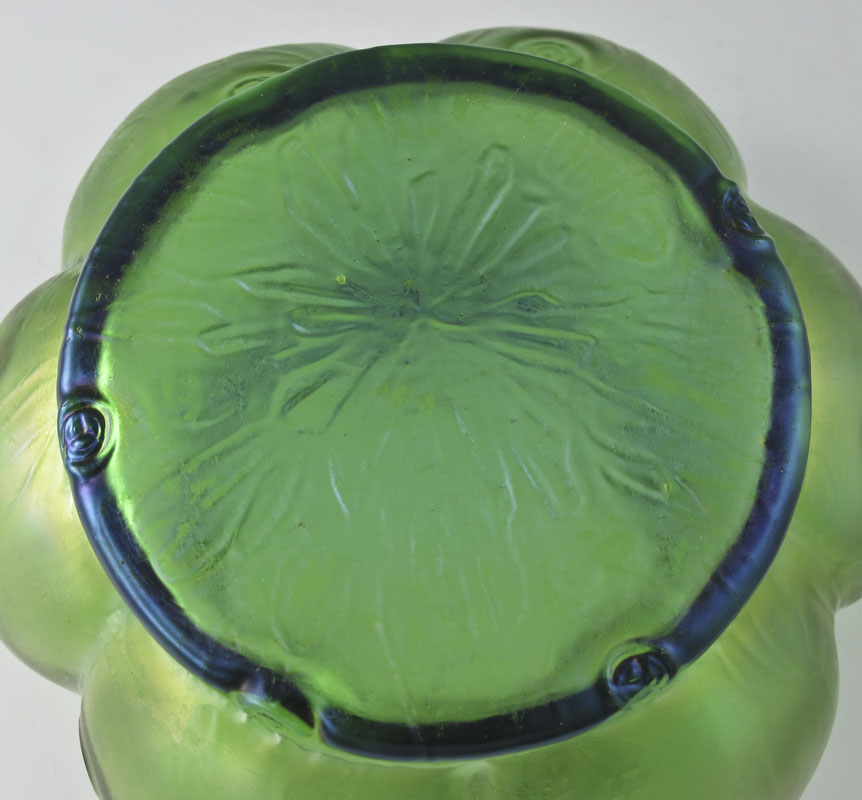 2 BOHEMIAN GLASS VASES: 1) Loetz attributed melon ribbed ferner in a bark texture, 4'' tall, 4'' at the rim. Remove the light and this piece turns deep iridescent blue. 2) Enamel decorated green glass, 5 1/2''.