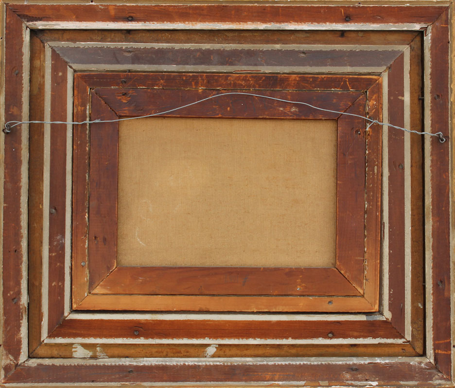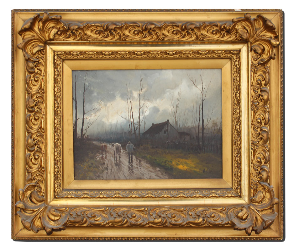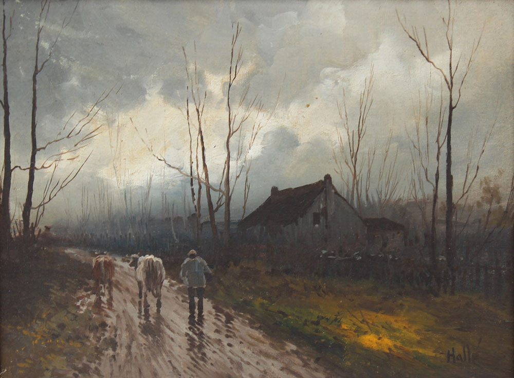 DUTCH PAINTING ''THE ROAD HOME'', SIGNED HALLE: Landscape with Man Herding Cows on a Dirt Road, Oil/Canvas, 9'' x 12'', signed lower right, gilded carved gesso frame with minor wear, 13'' x 16''.