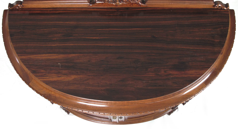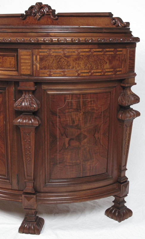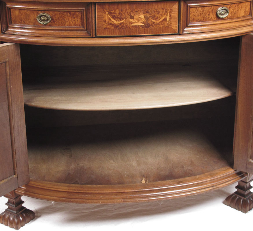 CARVED AND INLAID FRENCH COMMODE: Carved backsplash, single drawer with floral inlay, parquetry inlaid side panels with burl veneer. 2 doors surmounted by carved decoration, all on carved feet. 38 1/2'' h. x 50 1/2'' x 22''.