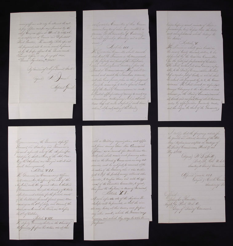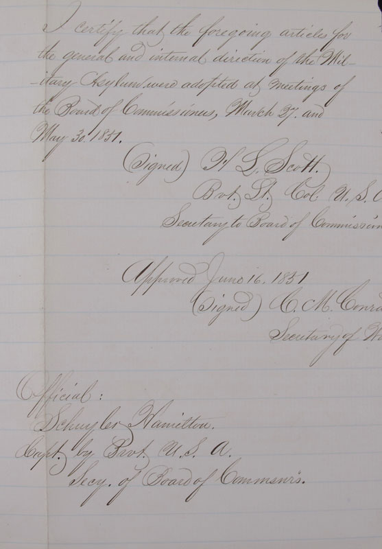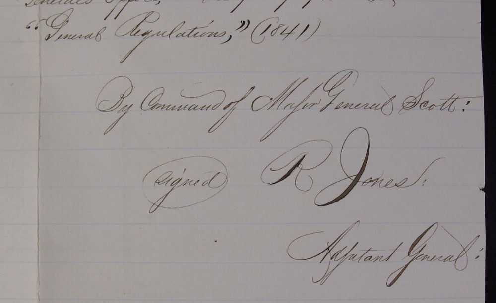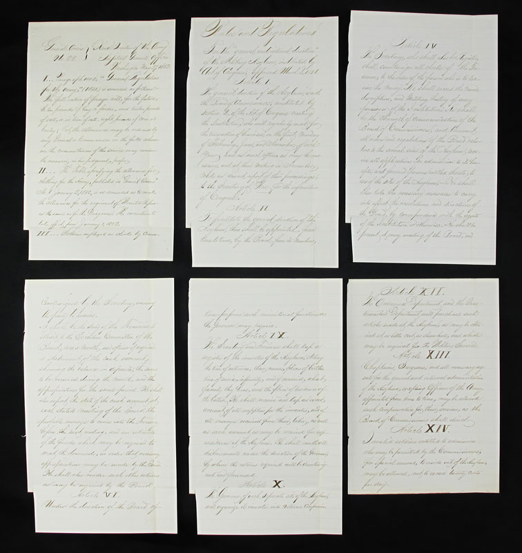HAND WRITTEN US ARMY GENERAL ORDERS 1832: Clipped from a book, hand written General Orders No. 22 dated May 27, 1832, regarding rations for horses, clothing for Mounted Riflemen to be the same as Dragoons, clerks for commanding officers to be paid .15 cents a day. By order of Major General (Winfield) Scott, R. Jones Adjutant General. Sold with 1851 hand written 5 page Rules and Regulations for the ''general and internal direction'' of the Military Asylum, orders by Brvt. Lt. Col. Scott, approved by Charles M. Conrad, Secretary of War, Capt. Schuyler Hamilton, official.