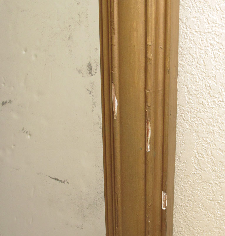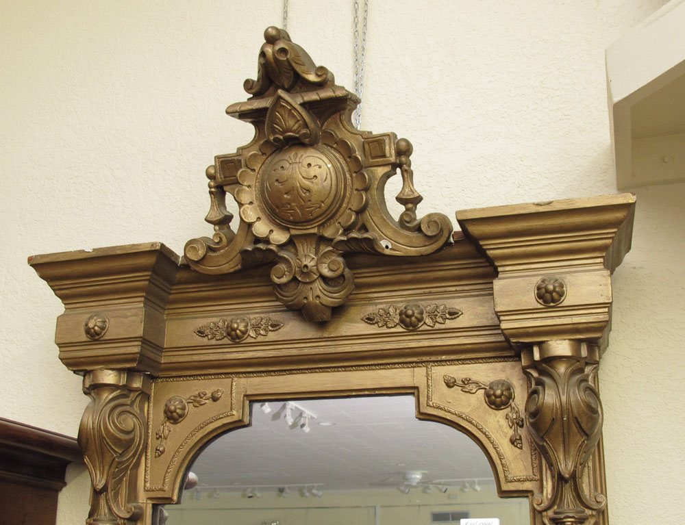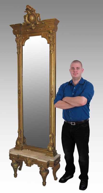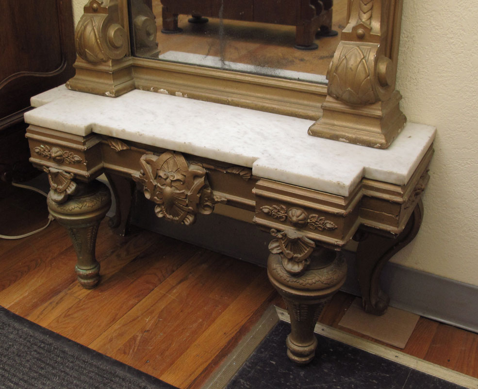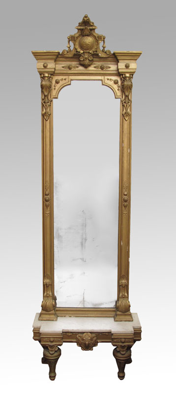 GOLD GILT PIER MIRROR ON MARBLE TOP BASE: Gold gilt decorated carved crest and framed, shaped and carved matching marble top base. Overall 102'' h. x 32'' x 12''.