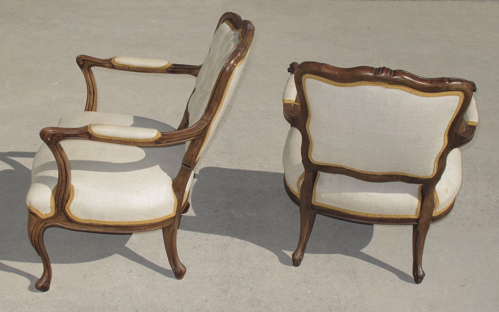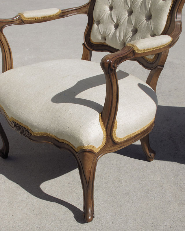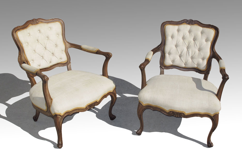 PAIR LOUIS XV STYLE FRENCH FAUTEUIL: Pair open arm chairs, molded cartouche shaped tufted back, padded arms, cabriole legs. 34'' h. x 27 1/4'' x 29''.