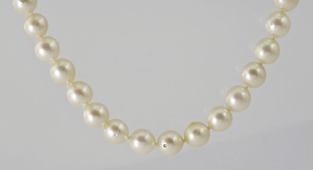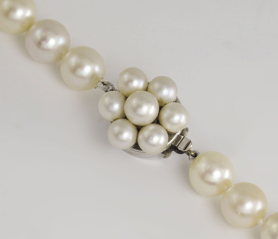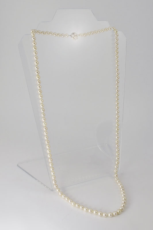 36'' LONG CULTURED PEARL NECKLACE WITH 14K PEARL CLASP: 36'' strand of 7.00 mm cultured pearls. 14K disc clasp with pearls. Dark cream in color. Lightly blemished with some peeling. Medium luster.