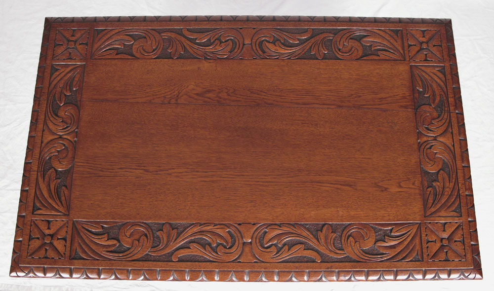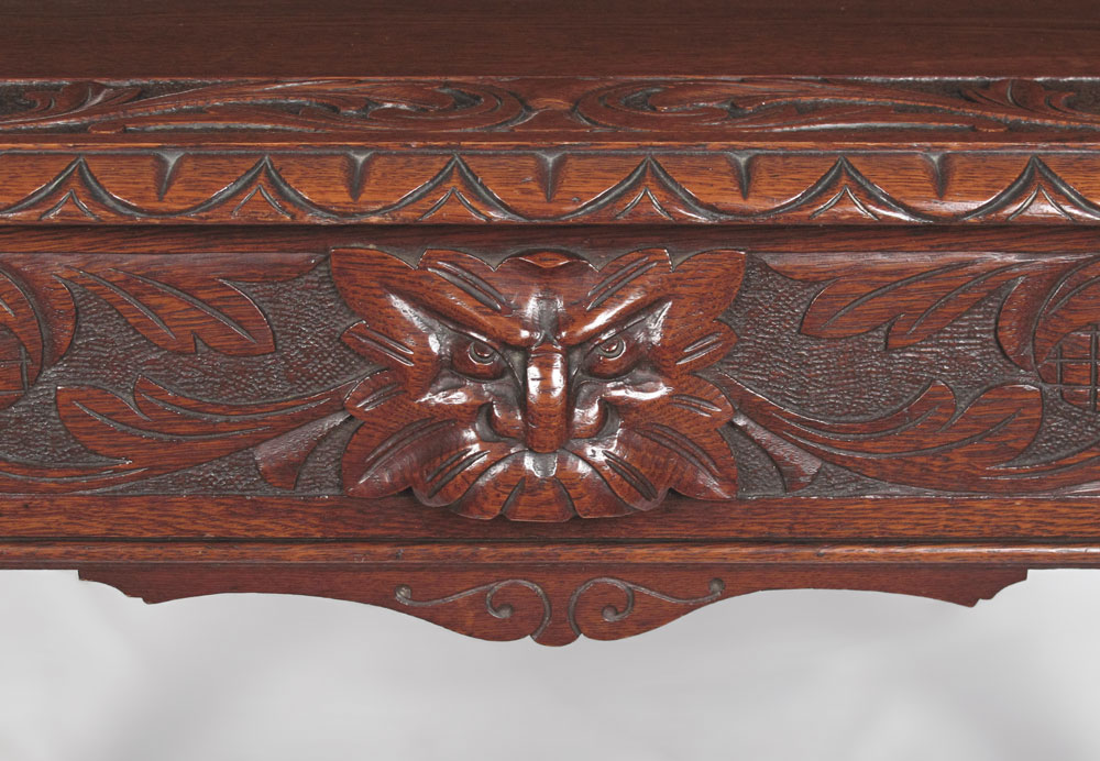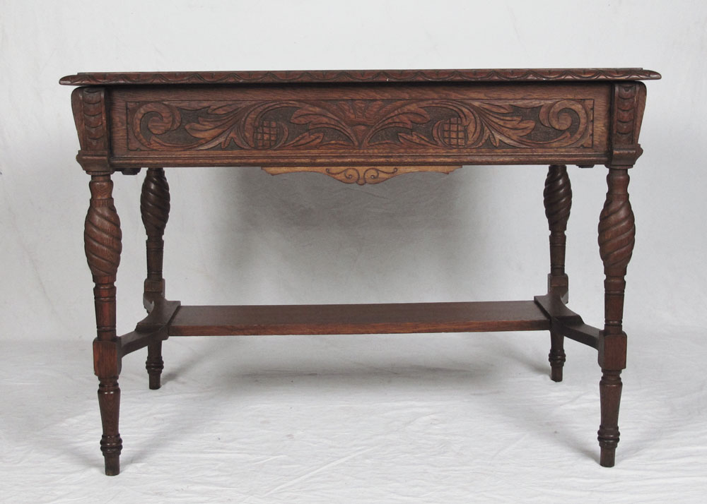 CARVED OAK LIBRARY TABLE: Lion carved drawer pull, carved border on the top, turned legs joined by stretcher shelf. 30'' h. x 42'' x 26 1/4''.