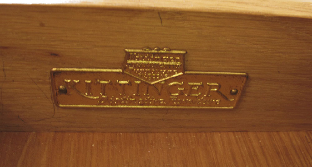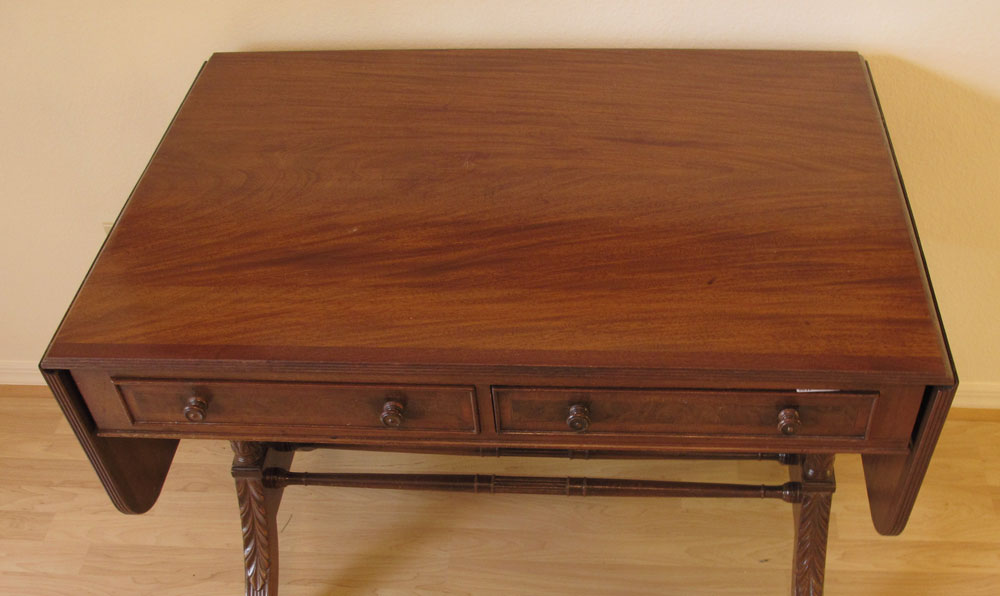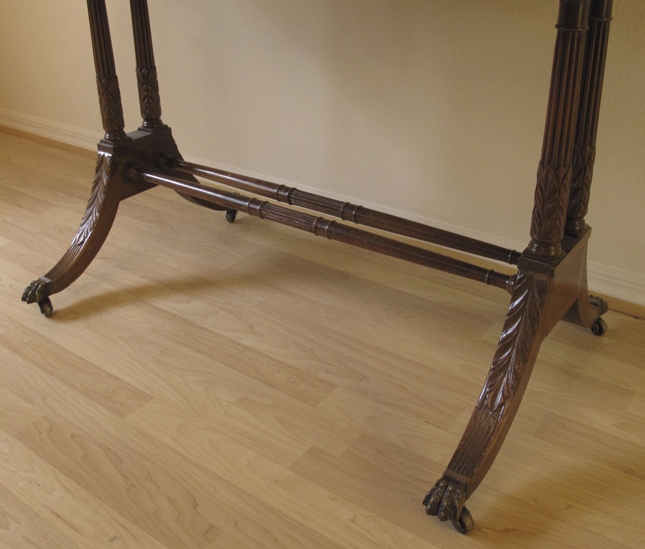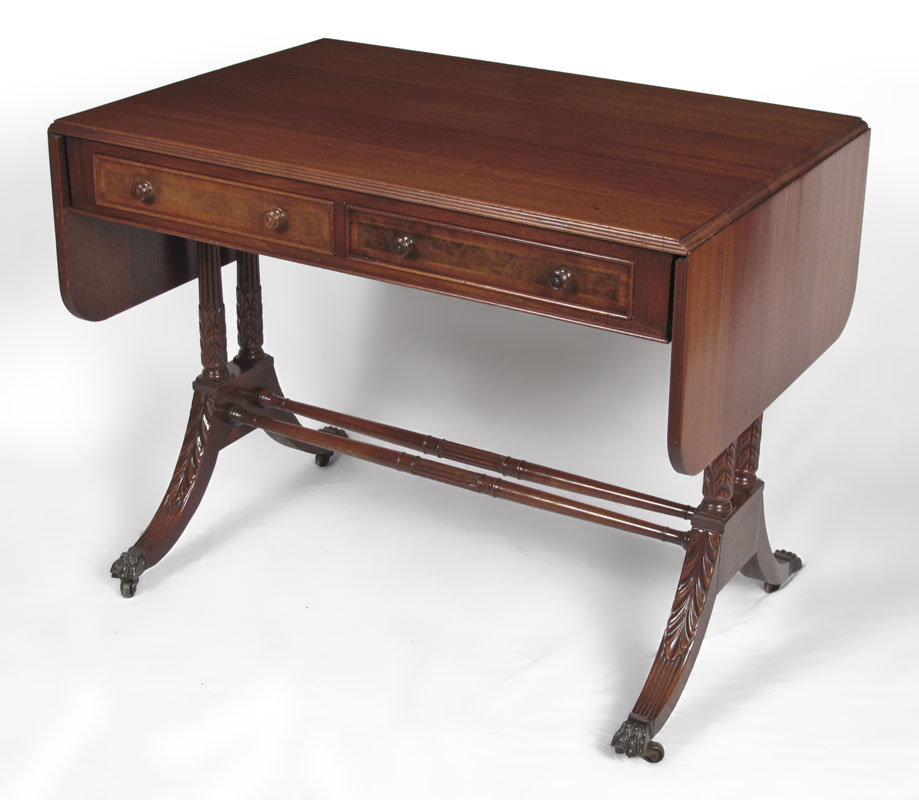 KITTINGER MAHOGANY WRITING TABLE: Two half length drawers, two drop leaves, double pedestal joined by stretchers, splayed legs, brass covered feet on castors. 29 1/2'' h. x 37'' x 25 1/4''.