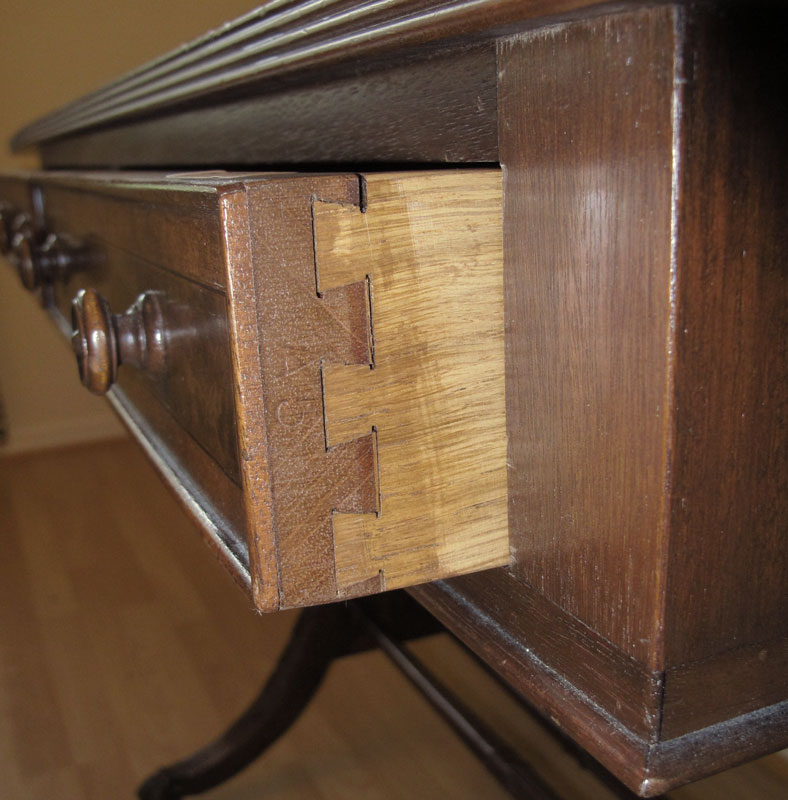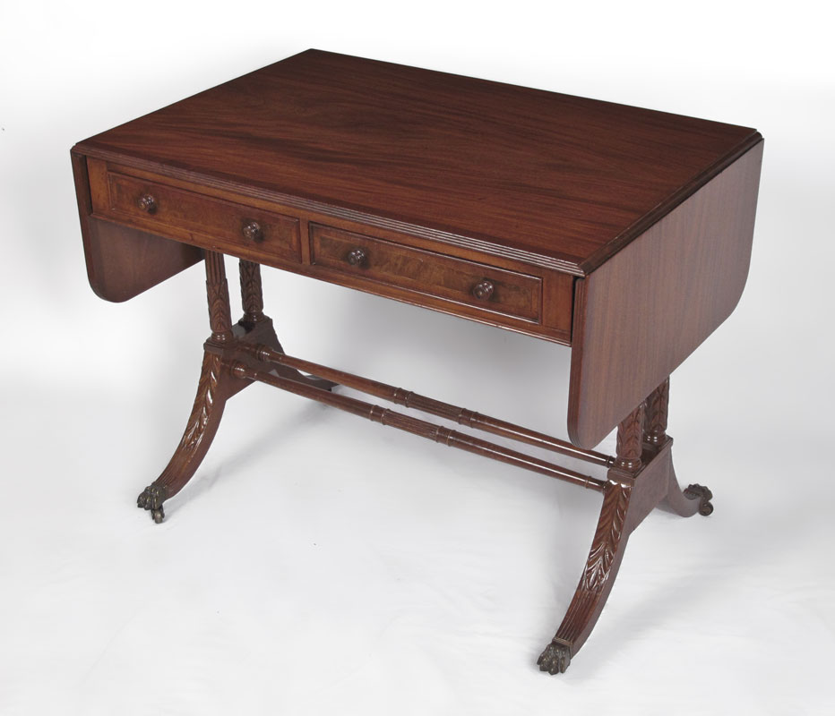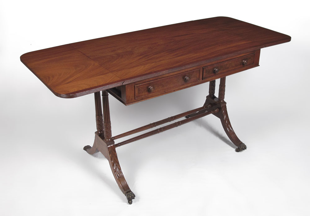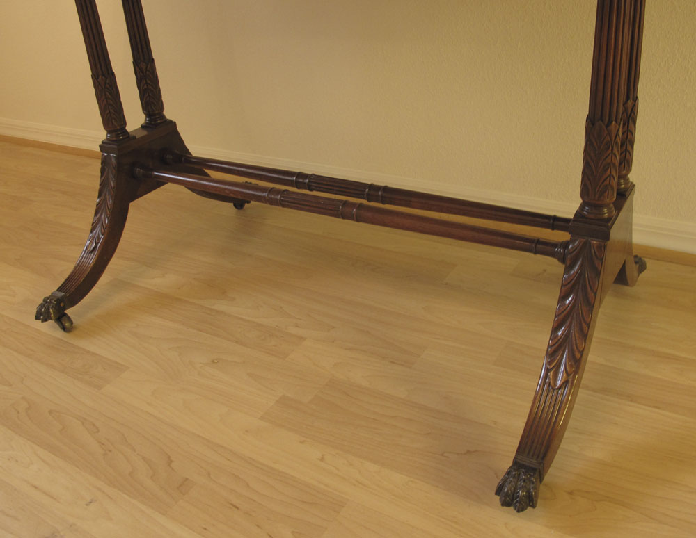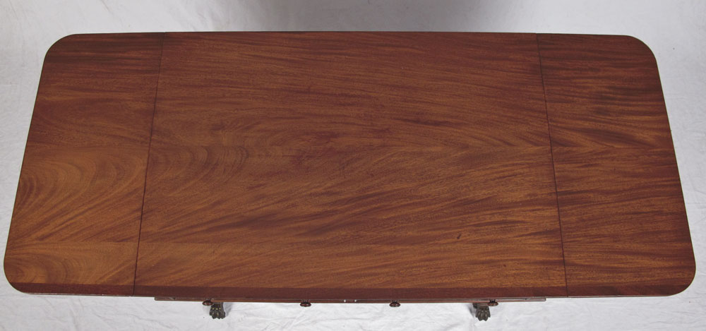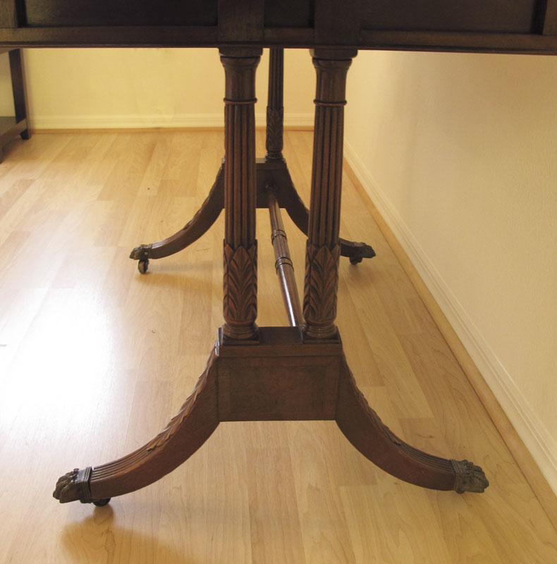 KITTINGER MAHOGANY WRITING TABLE: Two half length drawers, two drop leaves, double pedestal joined by stretchers, splayed legs, brass covered feet on castors. 29 1/2'' h. x 37'' x 25 1/4''.