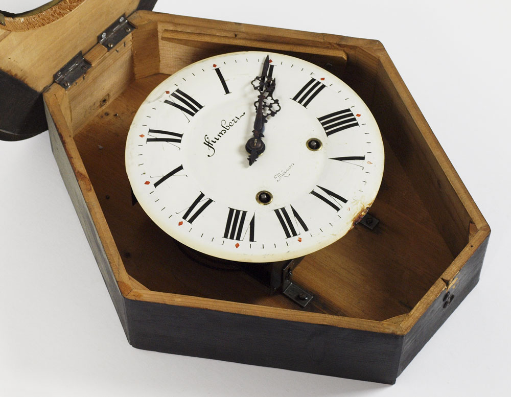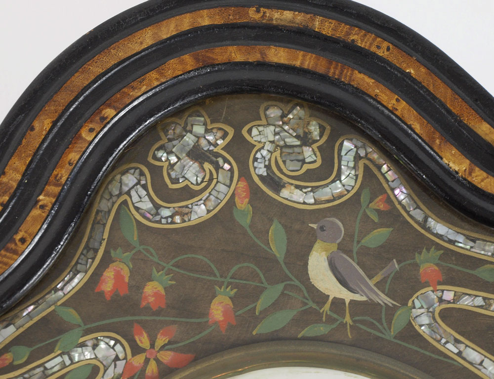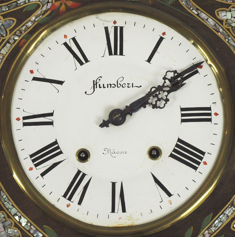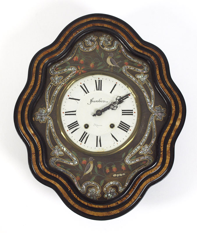 HUMBETH FRENCH MOTHER OF PEARL WALL CLOCK: Sometimes referred to as a ''bakers'' clock, shaped case. Mother of Pearl inlay and hand painted birds on branches decoration. Porcelain face with Arabic numerals. Key and pendulum in office. 24 1/2'' h. x 20'' x 5 1/4''.