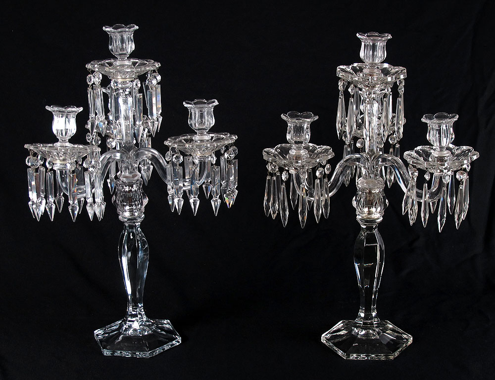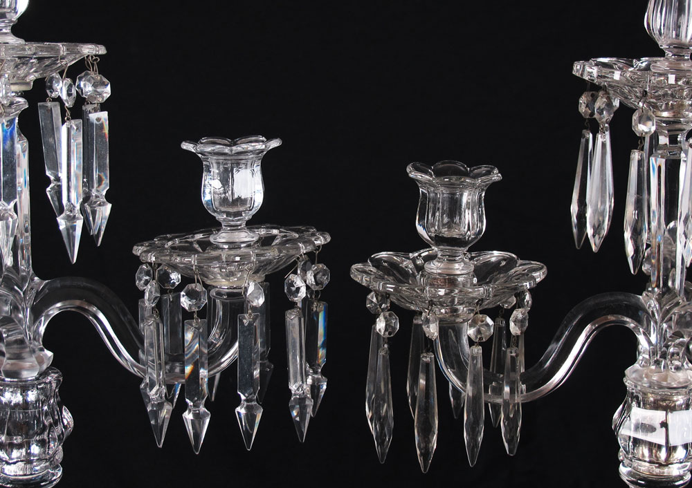 2 ELEGANT FOSTORIA GLASS CANDELABRUM: Each 4 light candelabrum similar in design, with differing prisms and bobeche, each approx. 22''h. x 9'' x 9''.