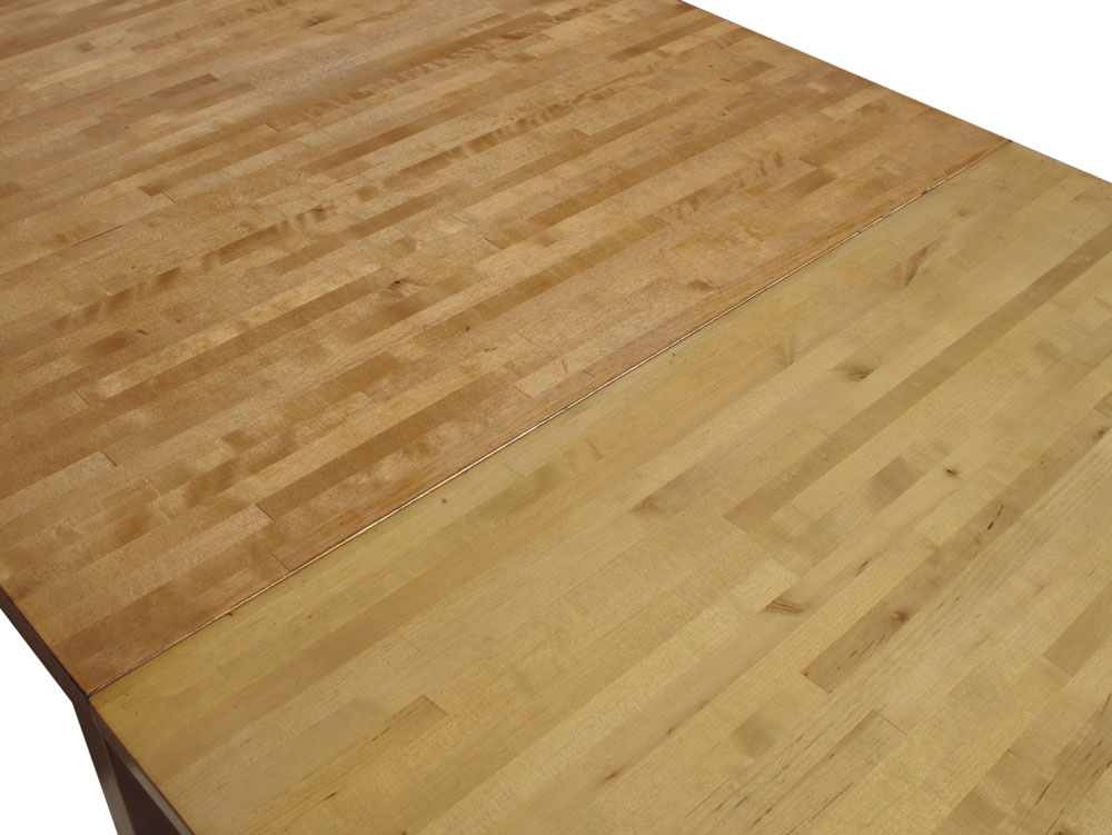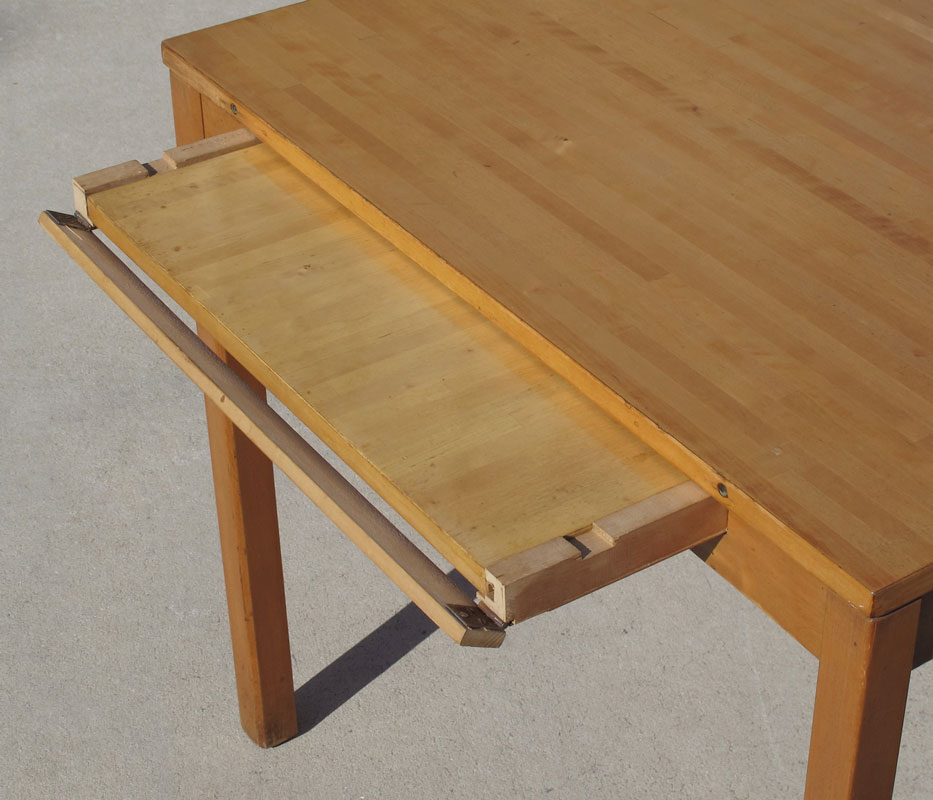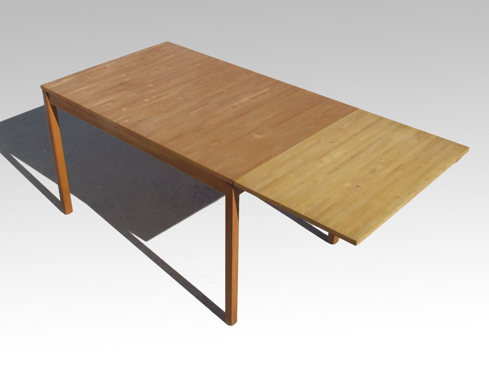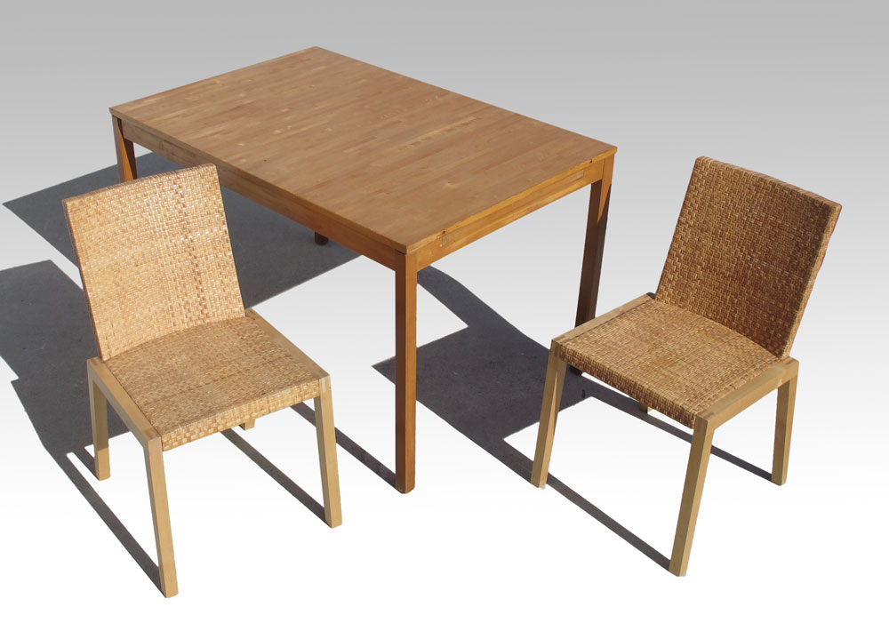 SWEDISH MODERN BIRCH TABLE AND 2 CHAIRS: Table with hidden leaf and slide out, 28 1/2'' h. x 47 1/4'' x 32''. Leaf 21 1/2''. Woven chairs 31'' h. x 17 1/8'' x 22''.