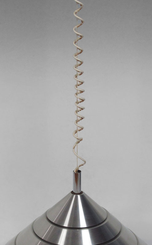 BRUSHED STEEL CEILING LAMP BY HANS AGNE JACOBSON: Cone shape, 23'' dia. Hans Agne Jacobson Label. Made in Sweden.