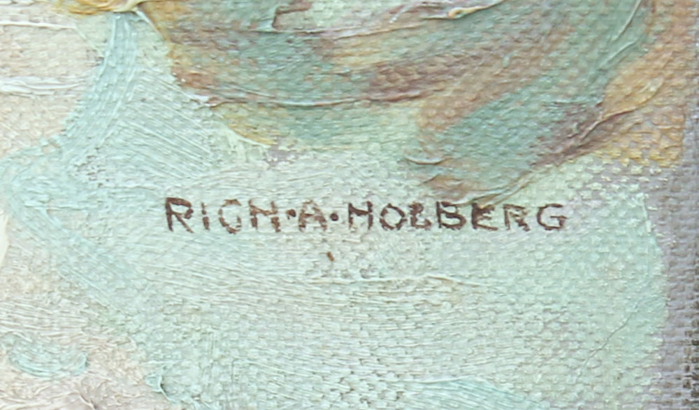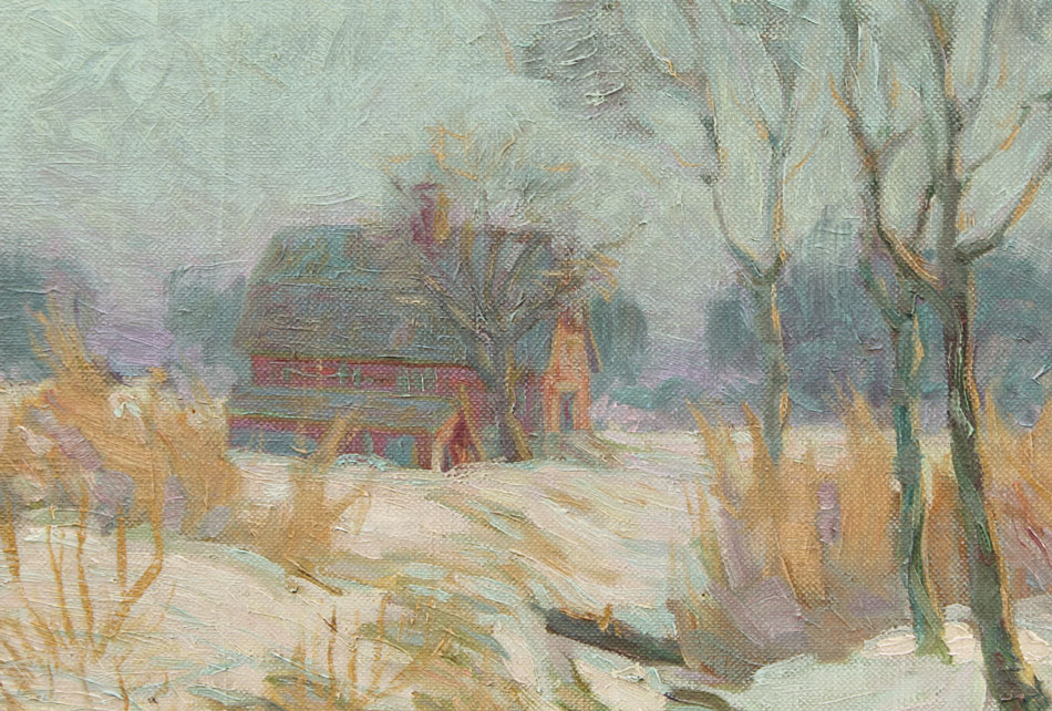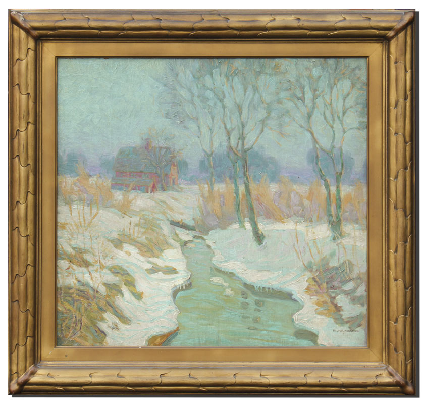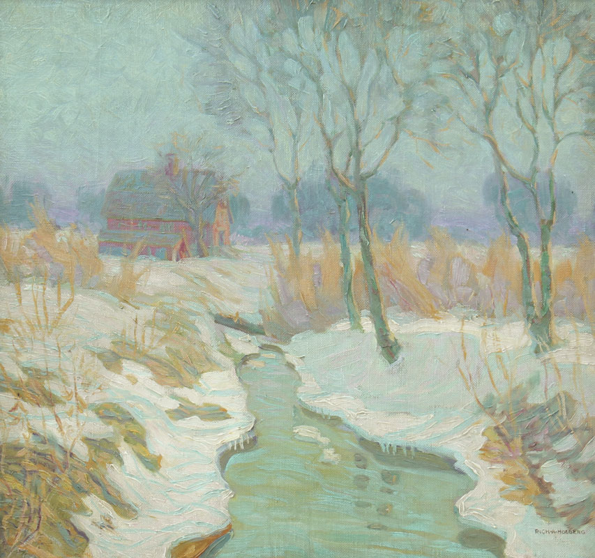 HOLBERG, Richard, (American, 1889-1947): Winter Stream with Red Barn, OIL/Canvas, 22'' x 24'', signed lower right, period carved and gilded gesso frame with minor wear, 29'' x 31''.