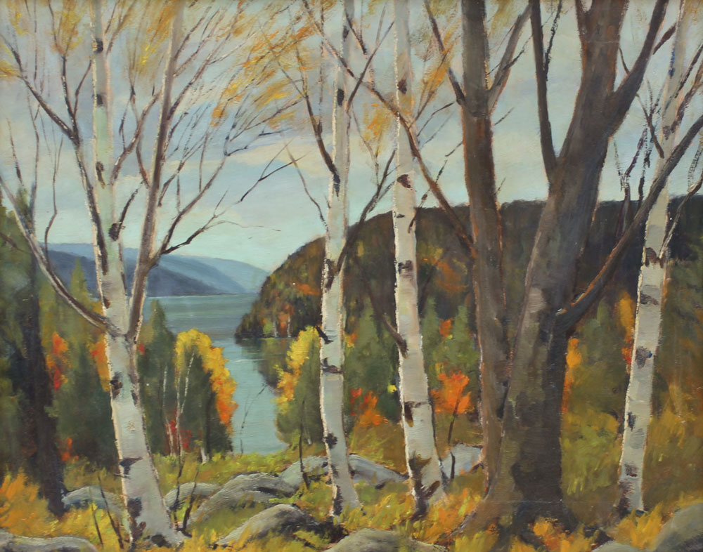 WILSON, B. Russell, (Canadian, 20th C.): Lakeside Scene Through the Birches, OIL/Masonite, 16'' x 20'', unsigned, framed, 21'' x 25''.