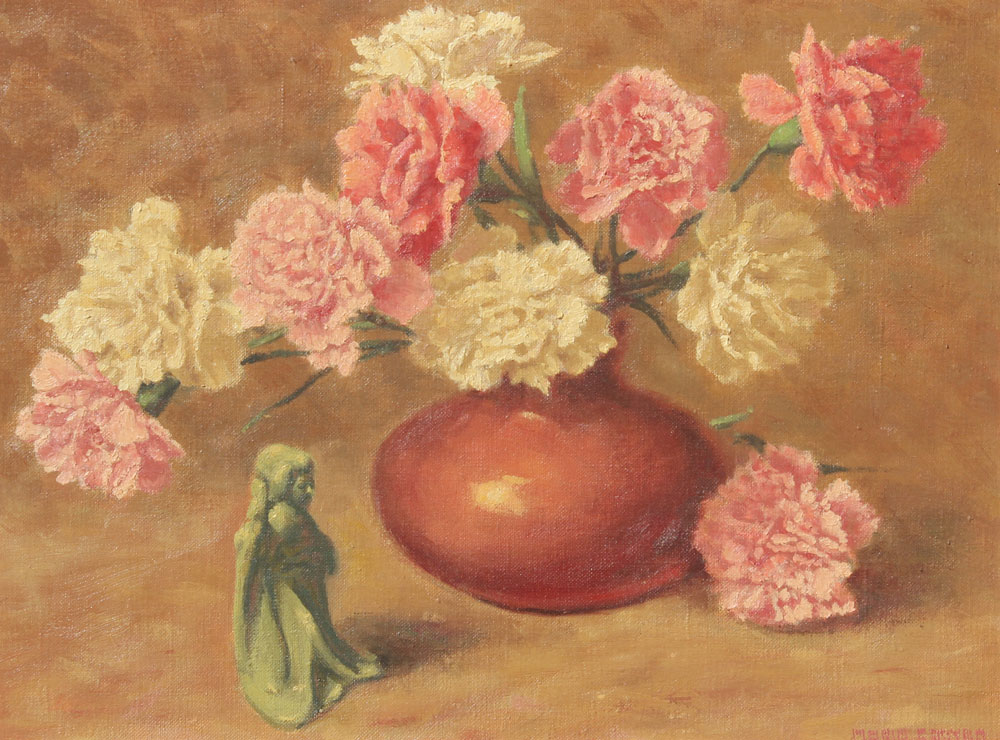 CASTRO, Mario, (American, 1916-2010): Still Life of Carnations and Oriental Idol, Oil/Canvasboard, 12'' x 16'', signed lower right, framed, 15'' x 18''.