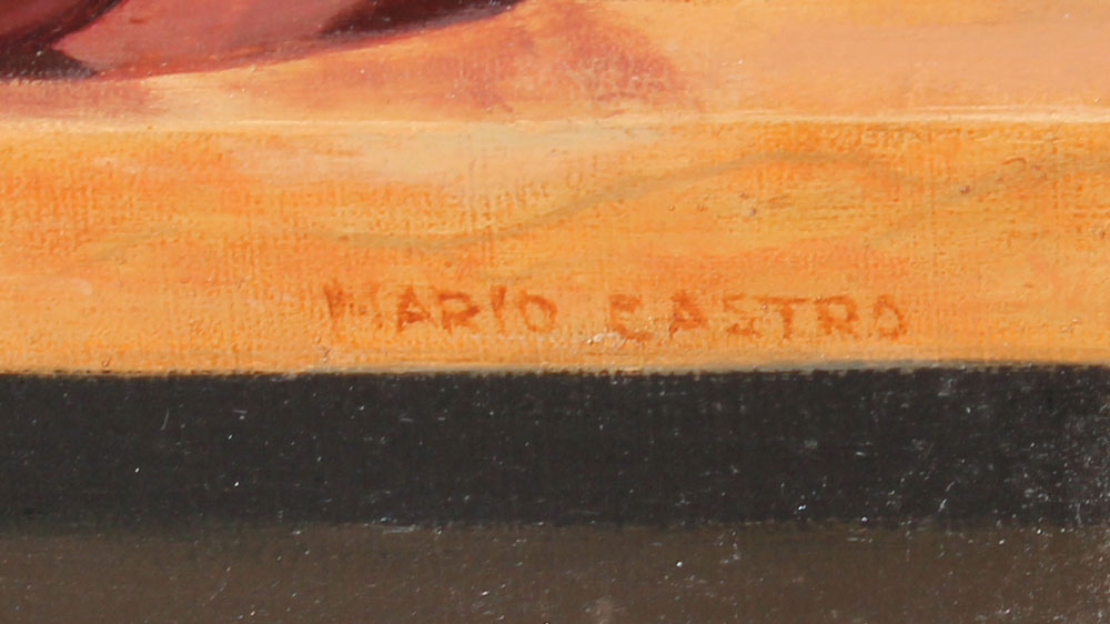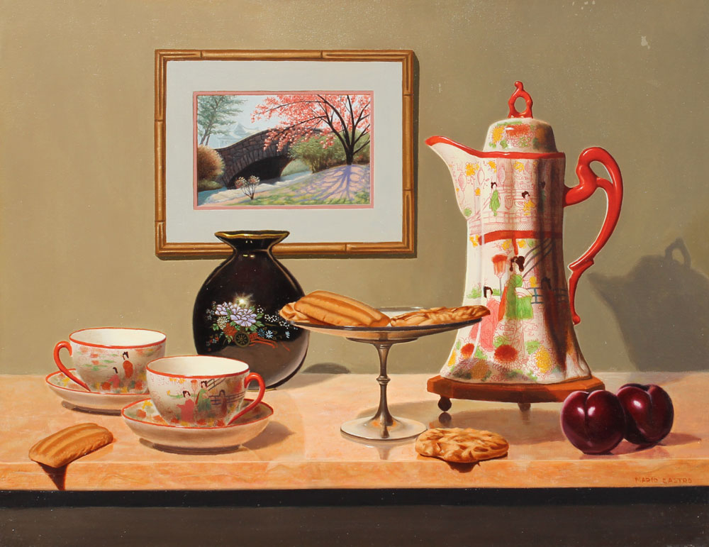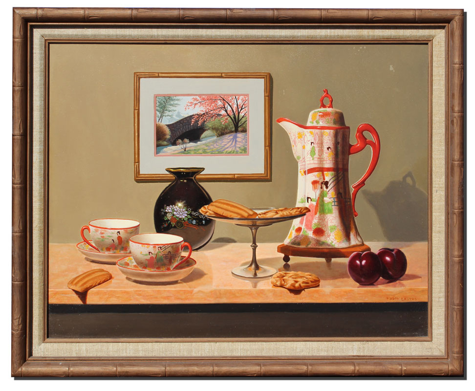 CASTRO, Mario, (American, 1916-2010): ''The Chocolate Pot'', OIL/Board, 18'' x 24'', signed lower right, Oriental motif frame, 22'' x 27 1/2'', label verso.