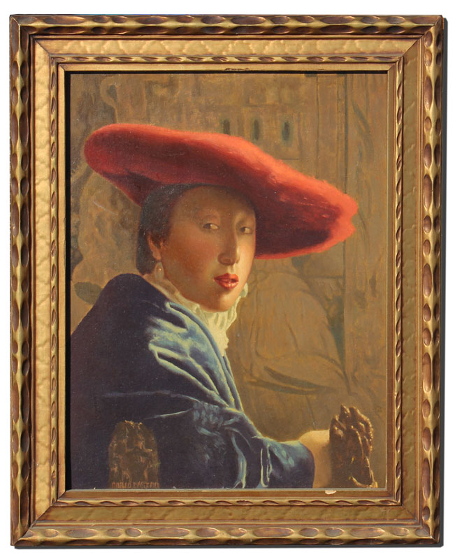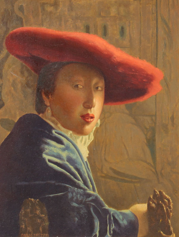 CASTRO, Mario, (American, 1916-2010): Girl Wearing Red Hat, After Vermeer, Oil/Canvasboard, 18'' x 14'', signed lower left, carved frame, 22'' x 18''.