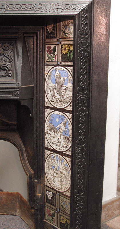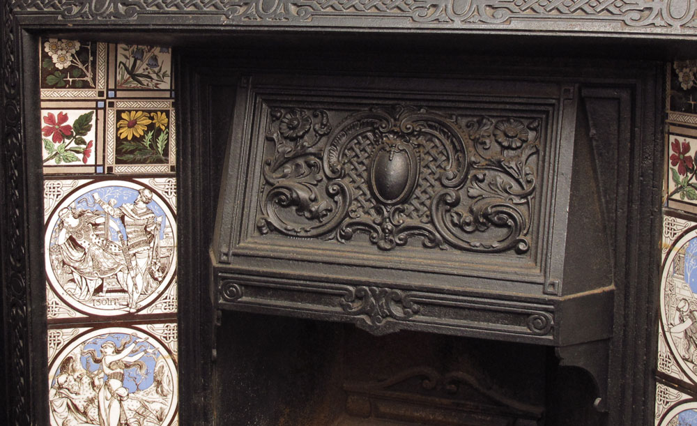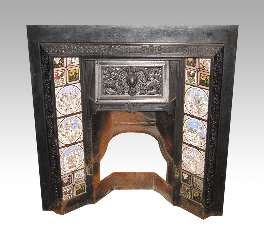 FRENCH CAST IRON FIREPLACE INSERT WITH TILE SURROUND: Cast iron fireplace insert with tiles featuring characters of King Arthur tales, Isolt, Vivien, Lynette, Gwinevere, Pelleas and Gareth. Measures 38 1/4'' h. x 36'' x 10 1/2''.