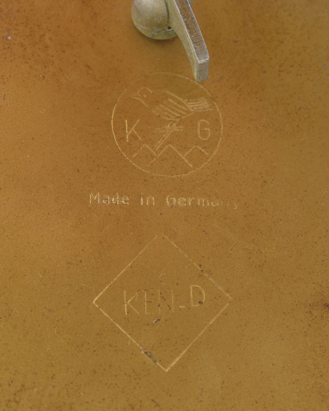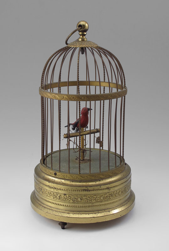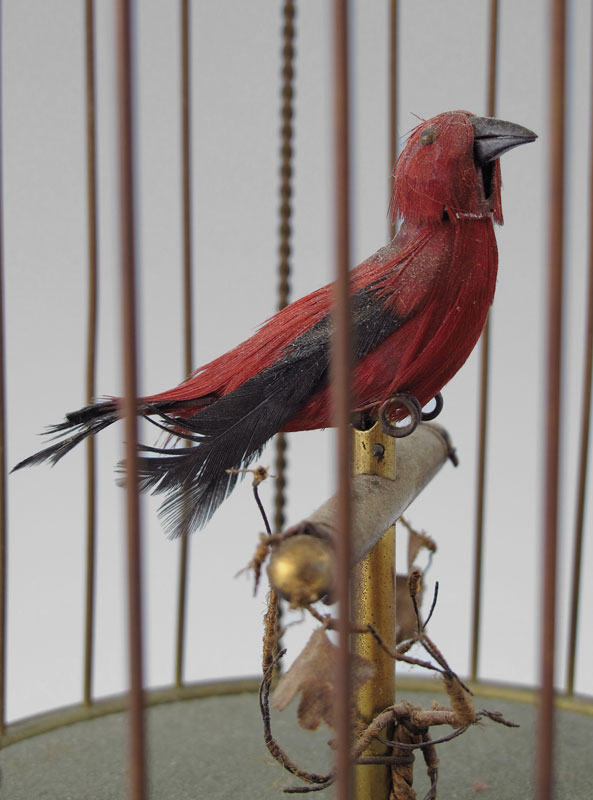 SINGING BIRD AUTOMATON: Red feather bird, head moves and chirps, in brass cage. Key wind with 3 setting lever. Marge K & G with bird, Made in Germany, Ken D on base. 11 1/2'' h. x 6 3/8'' dia.