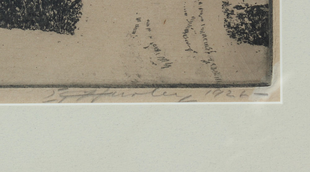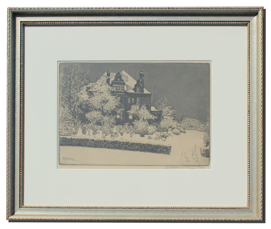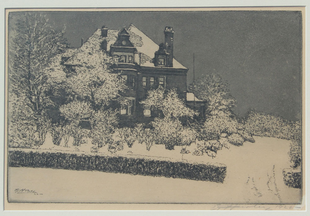 HURLEY, E.T., (American, 1869-1950): Wiedemann House, Newport, Kentucky, Etching, sight size 8 1/4'' x 12 1/2'', pencil signed lower right and dated 1926, silver gilt frame, 16 1/4'' x 20''. Harvey Hanaford Miller/Charles Wiedemann Collection.
