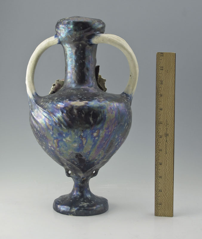 AMPHORA ART POTTERY HANDLED VASE: Flowers and berries motif, mottled glaze. Impressed Amphora pottery mark, illegible number. 14 3/4'' h. x 9''.