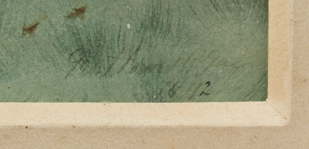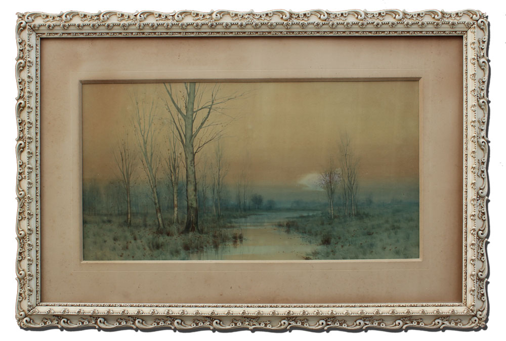 GAY, George, Howell, (American, 1858-1931): Misty Morning Landscape with Stream, Watercolor, sight size 13'' x 26'', signed lower right and dated 1892, painted frame, 24'' x 37''.