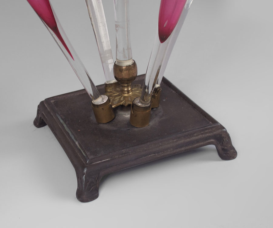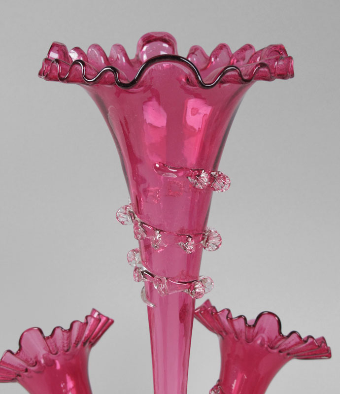 CRANBERRY GLASS EPERGNE: Five vases with ruffle rim and applied rigaree, metal base, 20'' tall.