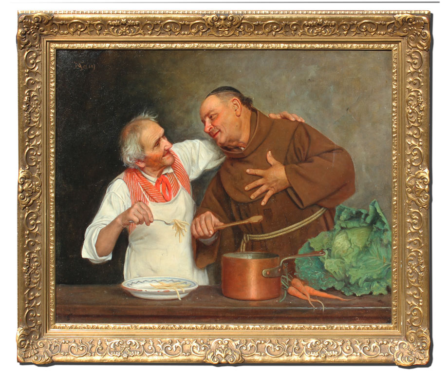 SANI, David, (Italian, 1828-1914): Monk and Chef in the Kitchen, Oil/Canvas, 23'' x 28 1/2'', signed upper left D. Sani, encased in gilded and carved frame with minor wear, 29'' x 34 1/4''. Harvey Hanaford Miller/Charles Wiedemann Collection.