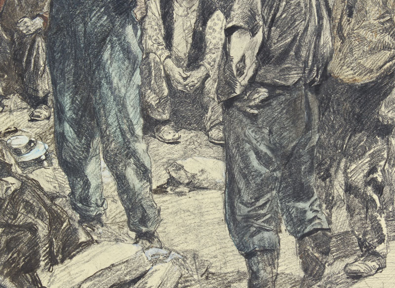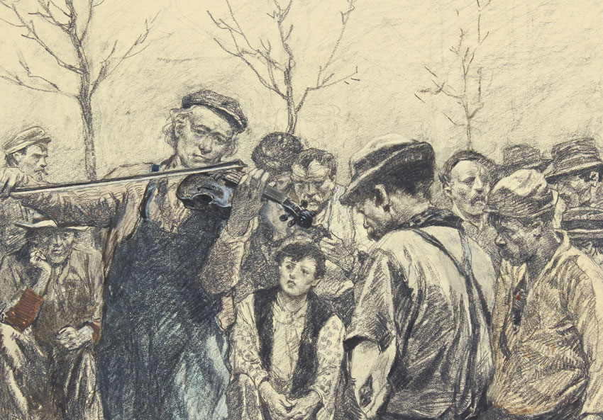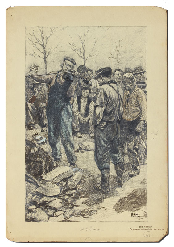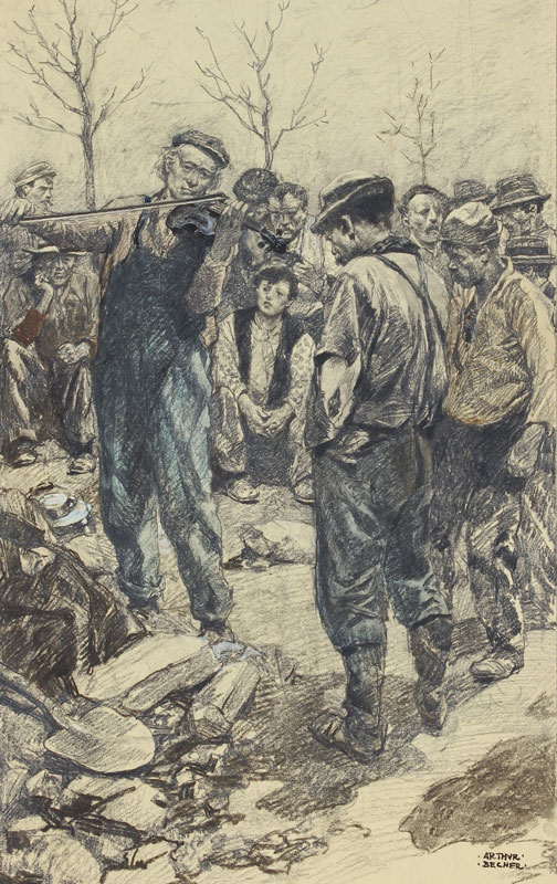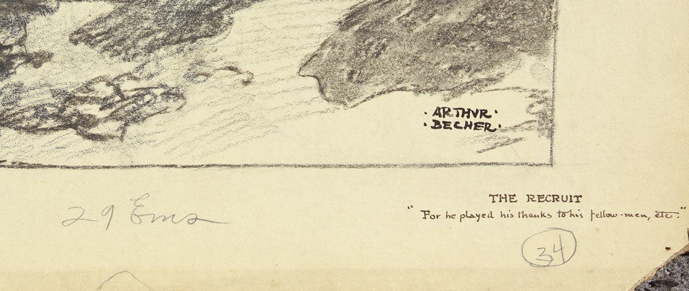 BECHER, Arthur, (American, 1877-1950): ''The Recruit'', Charcoal and Graphite with Watercolor, image size 24 1/2'' x 15 1/4'', with margins, 29 3/4'' x 20 1/2'', signed lower right, illustration for 1911 Redbook magazine story, titled lower right and captioned, ''For He Played His Thanks To His Fellow Men, Etc.'' Directly descended in the artist's family.