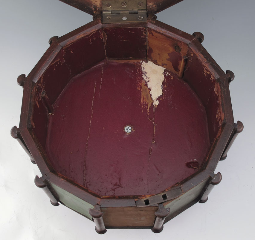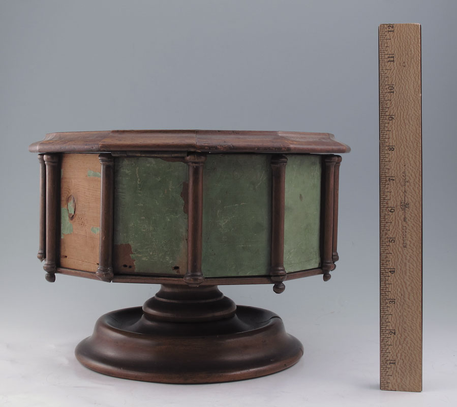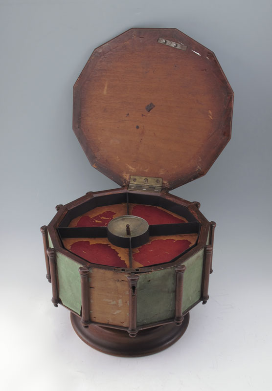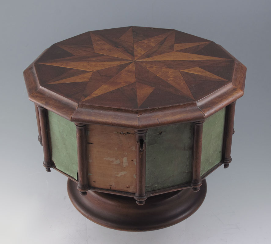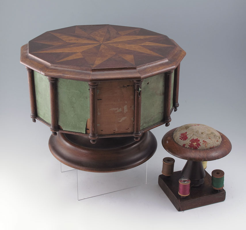 19th C SEWING BOX AND PIN CUSHION: The revolving sewing box with hinged top inlay in a star design. The interior has a compartmented lift out tray with storage underneath. 8'' h. 12 '' dia. The walnut needlepoint top pin cushion hold four spools. 5 1/2'' x 5 1/2''.