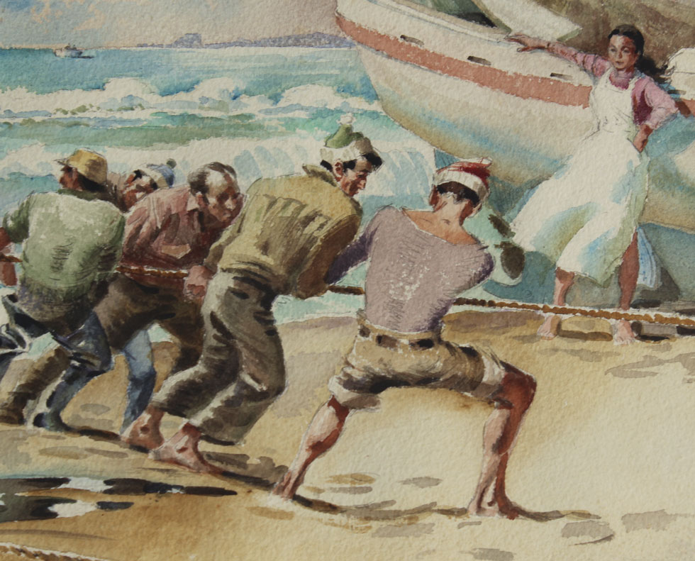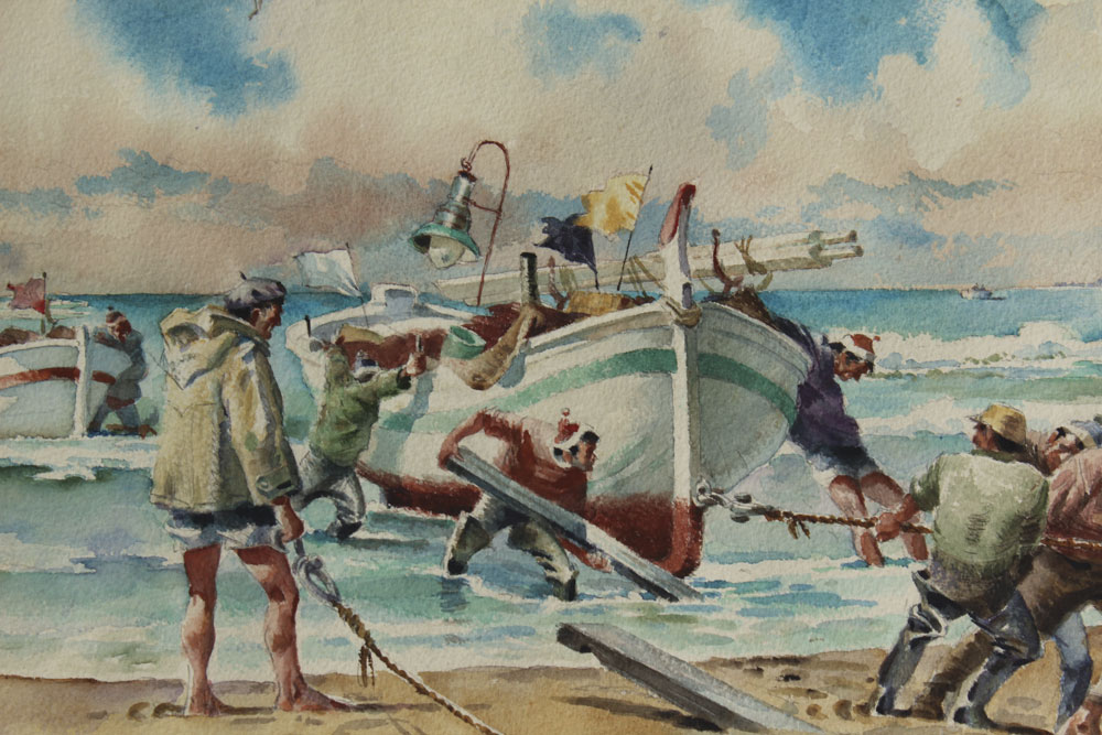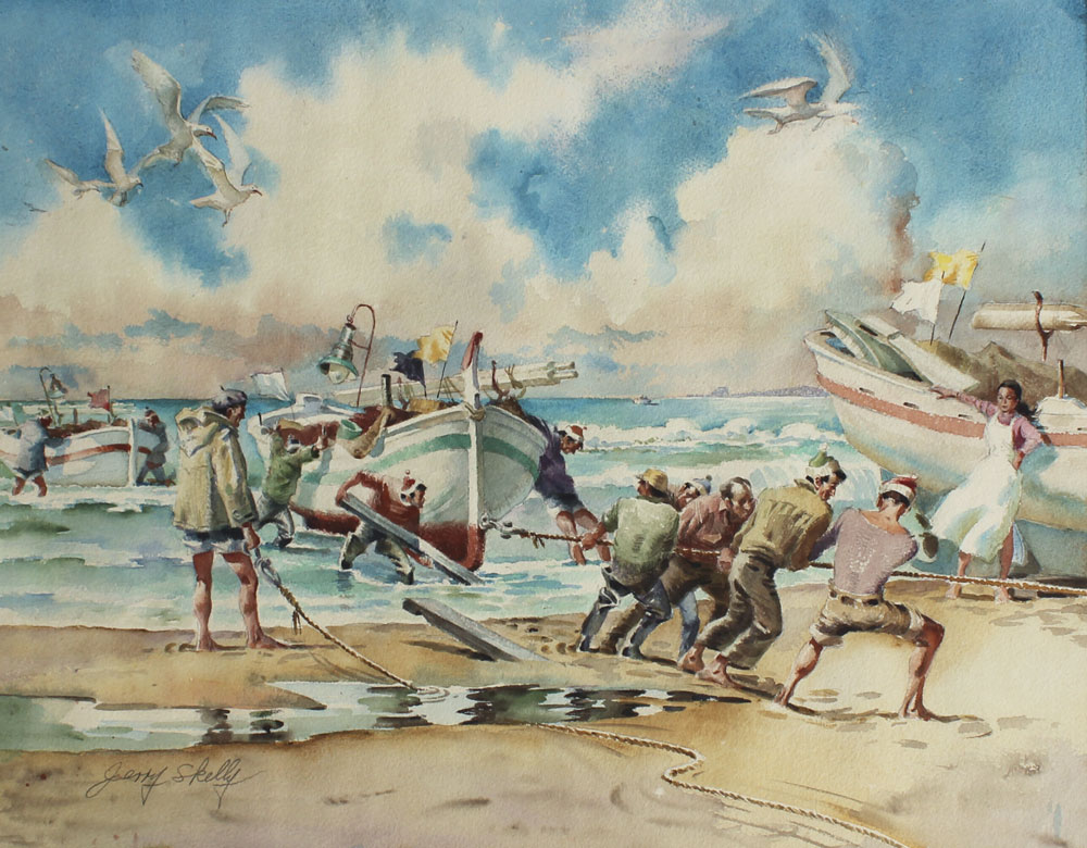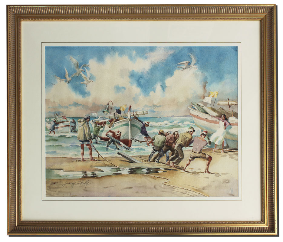 SKELLY, Jerry, (American, 20th C.): ''Returning Fisherman'', Watercolor, 17 1/2'' x 23 1/2'', signed Jerry Skelly lower left, framed, 26'' x 32 1/2''.