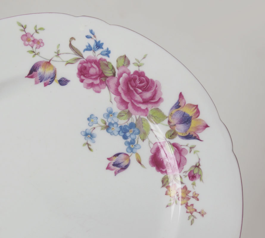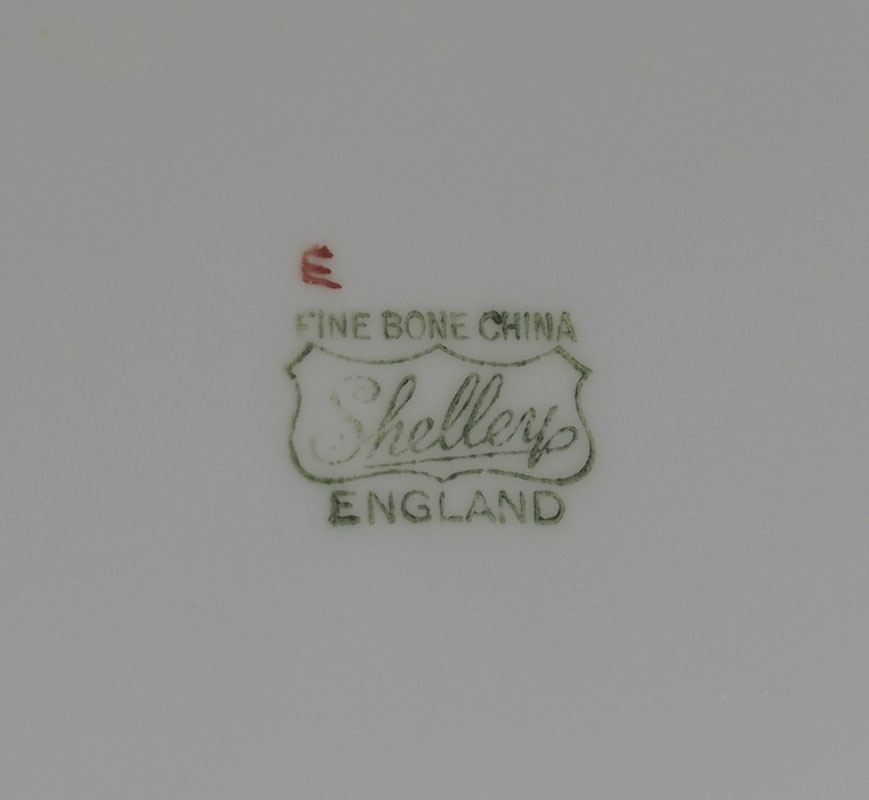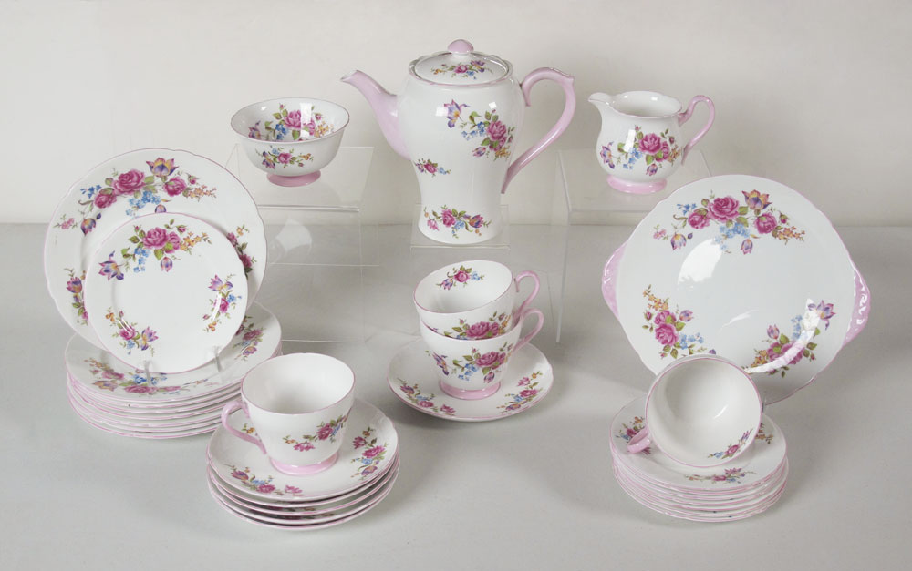 SHELLEY FINE BONE CHINA BREAKFAST SET: Luncheon or dessert. Set includes the coffee pot, open sugar, cream pitcher, serving plate, 8 plates (8''), 8 plates (6''), 4 cups, and 5 saucers.