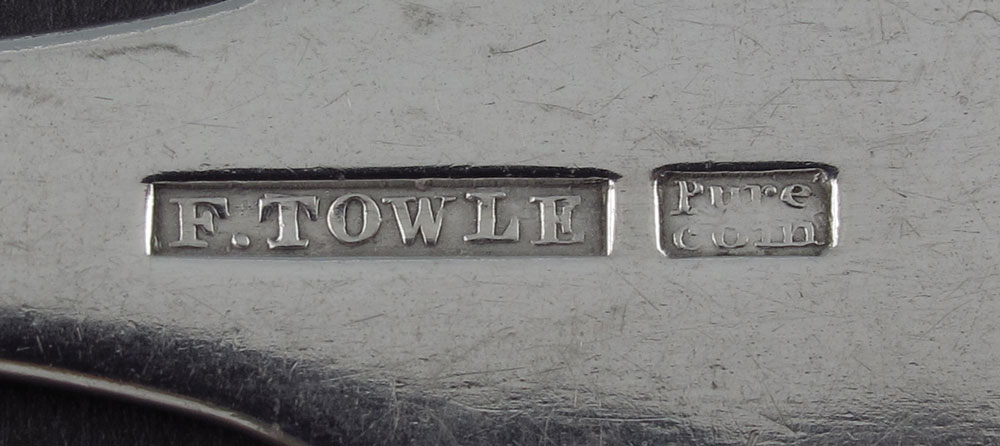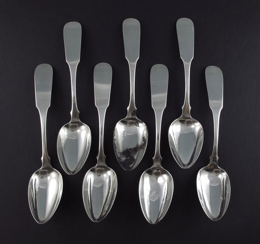 ANTHONY FRANCIS TOWLE 7 PC EARLY AMERICAN COIN SILVER SPOONS: Marked F. Towle Pure Coin, monogramed WNR large soup spoons. 8 3/8'' long. Approx. 11.4 troy oz