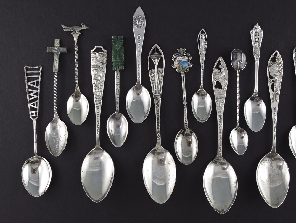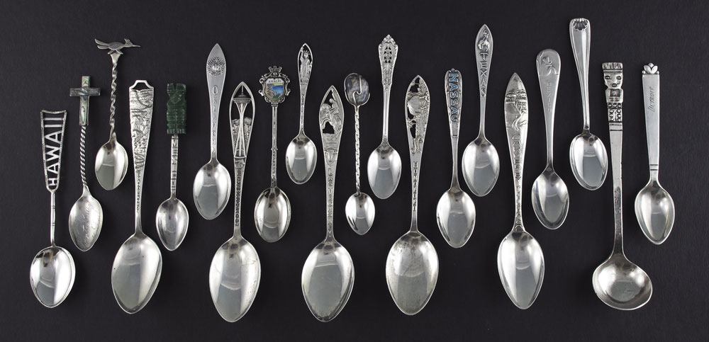COLLECTION OF STERLING SILVER TOURIST SPOONS: 19 spoons to include Honolulu, Carmel by the sea, CA, Las Vegas, Grand Canyon, Seattle World's Fair '62, Texas, Santa Cruz, California, Road Runner Inca head on ladle, Lapis stone on end, Wallace sterling Fransic I, Mexico Nassau, Oklahoma, Hawaii, New York, Mexico, Detroit. Sold with silverplate Amalfi coast spoon. Approx. 5.9 troy oz sterling, 2.4 troy oz. 800 silver, note weight includes 2 stones.