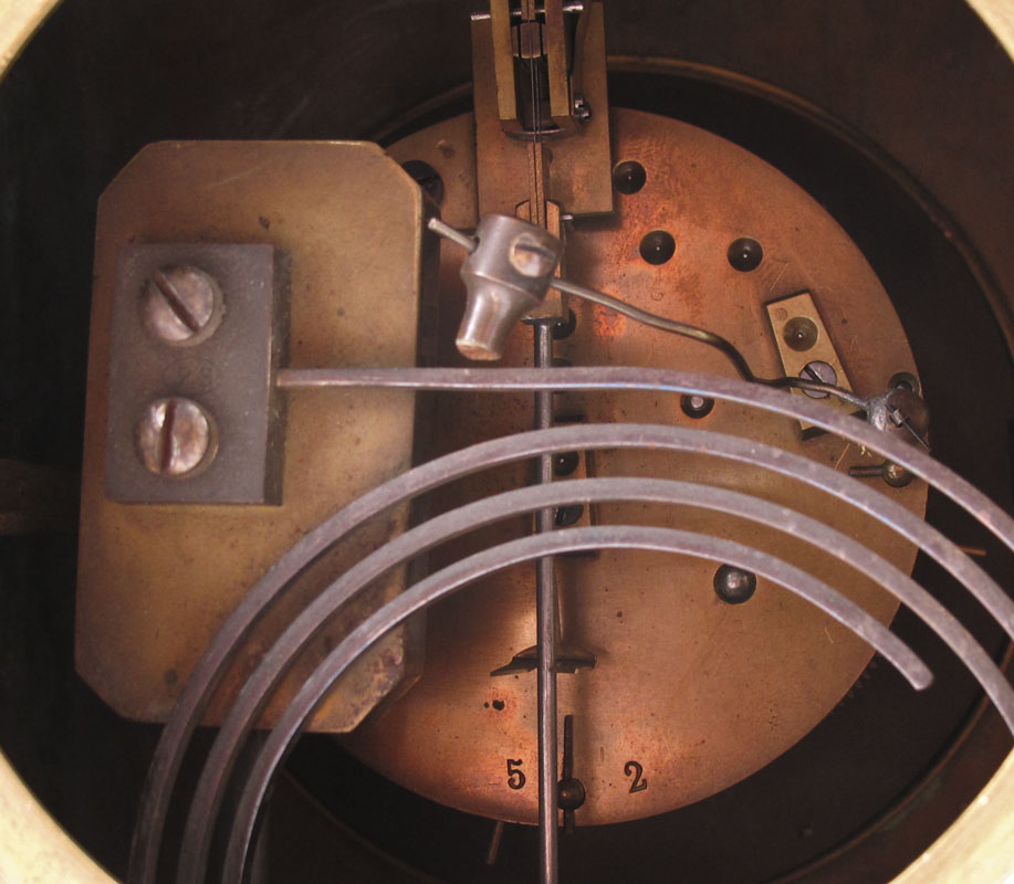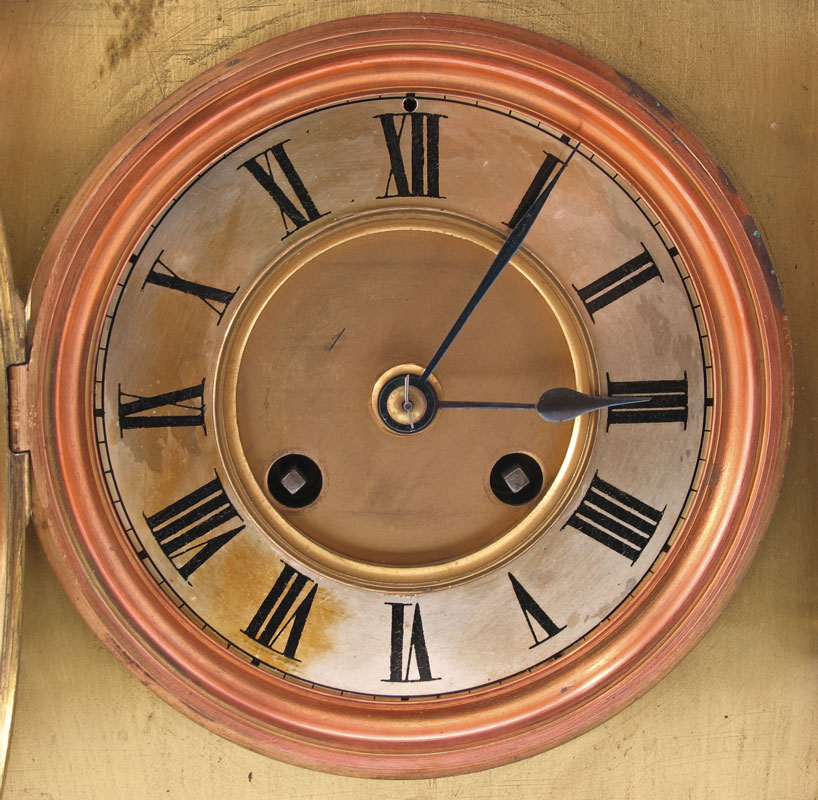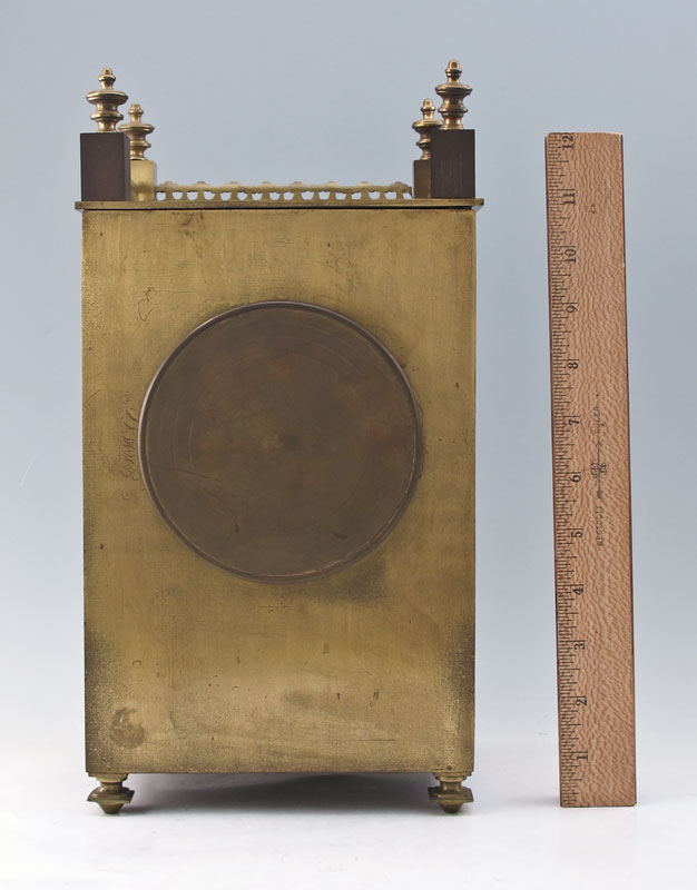 FRENCH BRASS REGULATOR SHELF CLOCK: Brass case with top openwork gallery and finial. Cast full column supports, beveled glass crystal. Mixed metal face with Roman numerals. Unmarked key wind pendulum time and strike movement. Pendulum in office, no key. 13 1/2'' h. x 7 1/4'' x 5 5/8''.