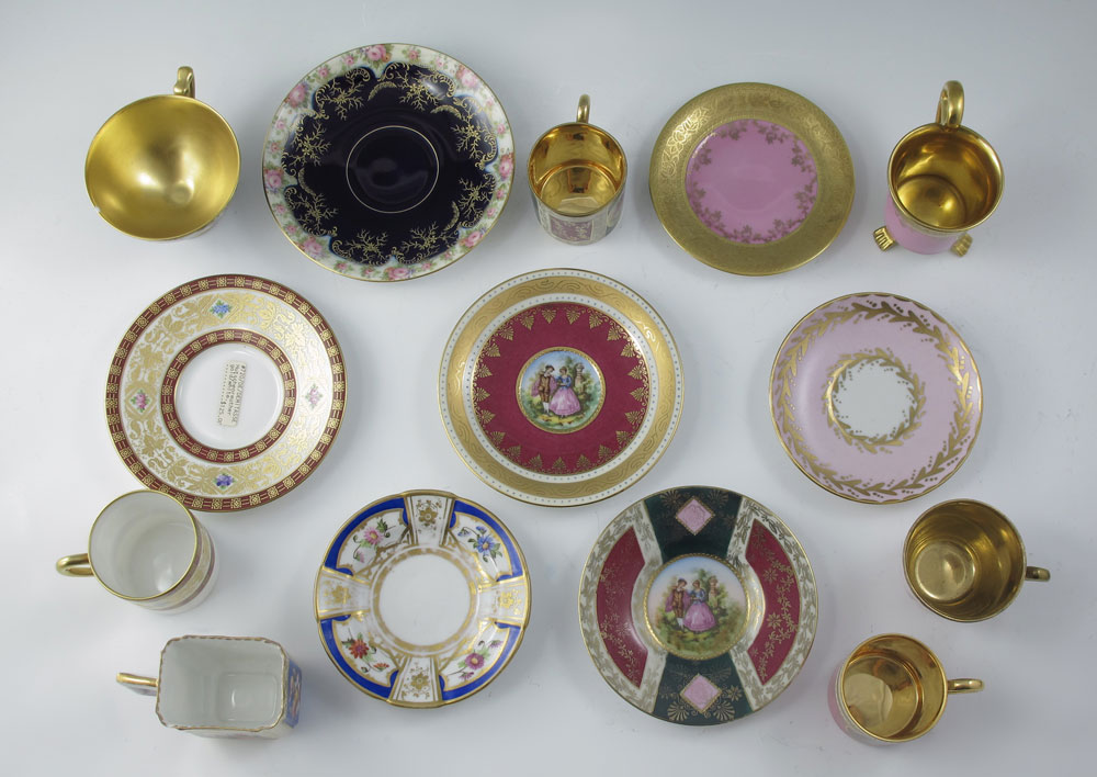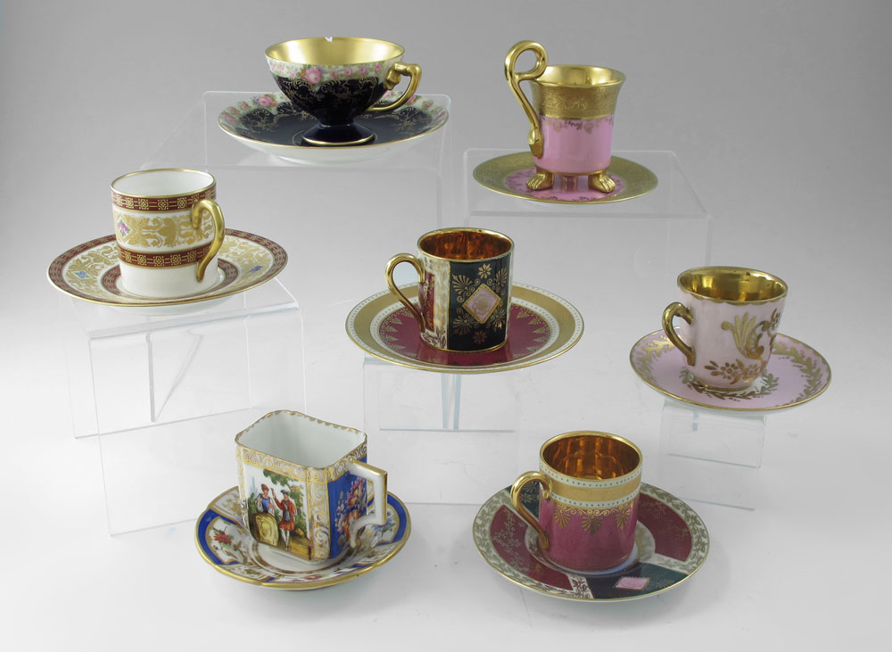 7 FINE AUSTRIAN PORCELAIN CUPS AND SAUCERS: An assembled collection to include Rosenthal, J.K. Decor, Hutchenreuther, Dresden and others. Largest cup and saucers 2'' h. x 3 5/8'', saucer, 4 7/8''.
