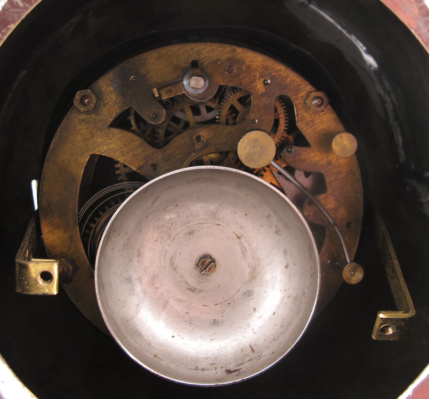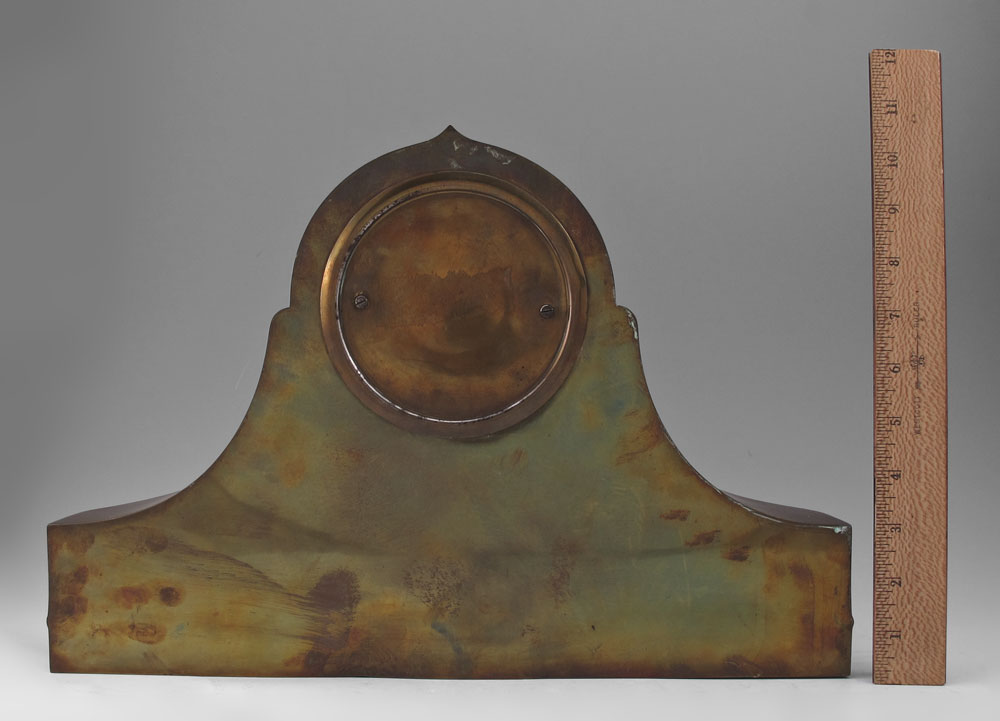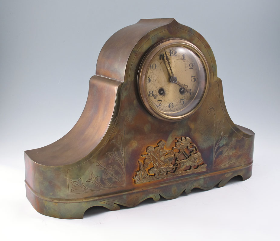 FRENCH BRASS HUMPBACK MANTLE CLOCK: Thin brass humpback case with engraved and applied cast decoration. Unmarked key wind time and strike movement. No key. 10 1/2'' h. x 15 1/2'' x 4 3/4''.