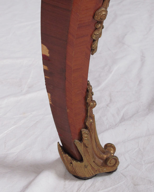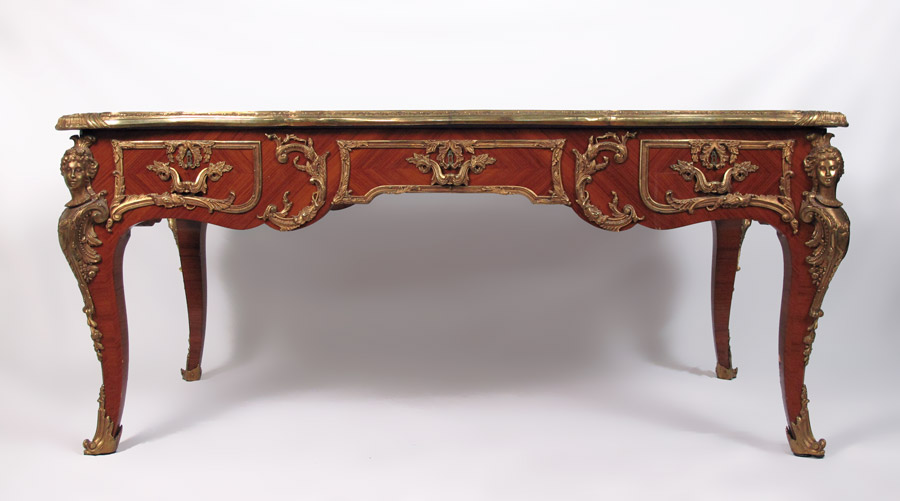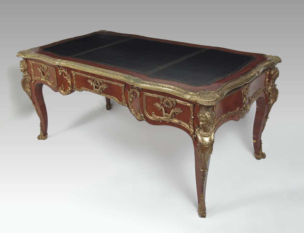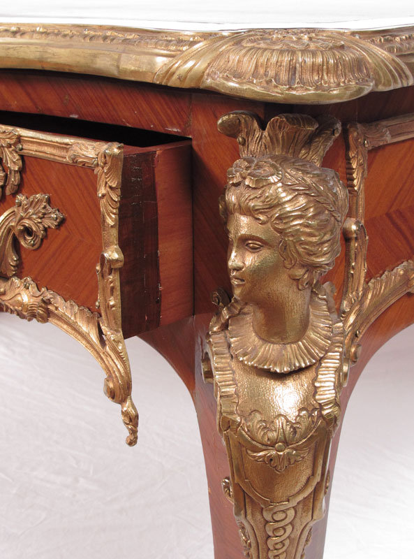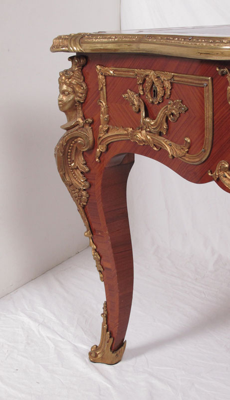 FRENCH ORMOLU MOUNTED LEATHER TOP BUREAU PLAT: Large inlaid Louis XIV style desk having exquisite bronze dore mounts and gold leaf embossed leather top. Key in office. 32''h. x 67 1/2'' x 23 1/2''