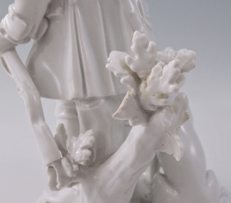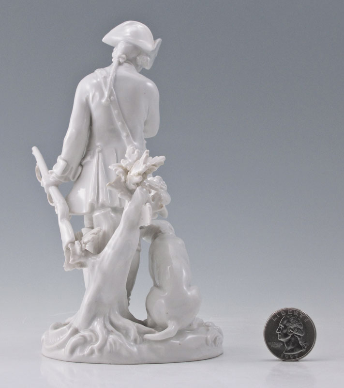 MEISSEN BLANC DE CHINE PORCELAIN FIGURE: Scene of a hunter with his trusty dog. Crossed swords underglaze mark, impressed X8A. 7'' h.