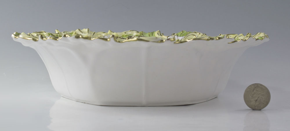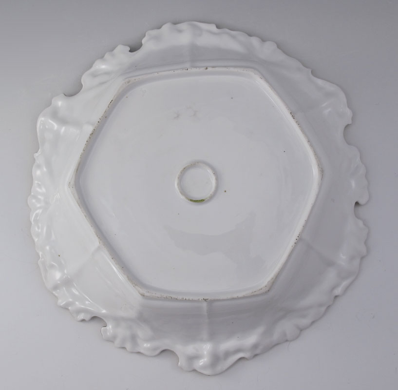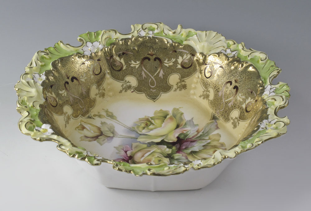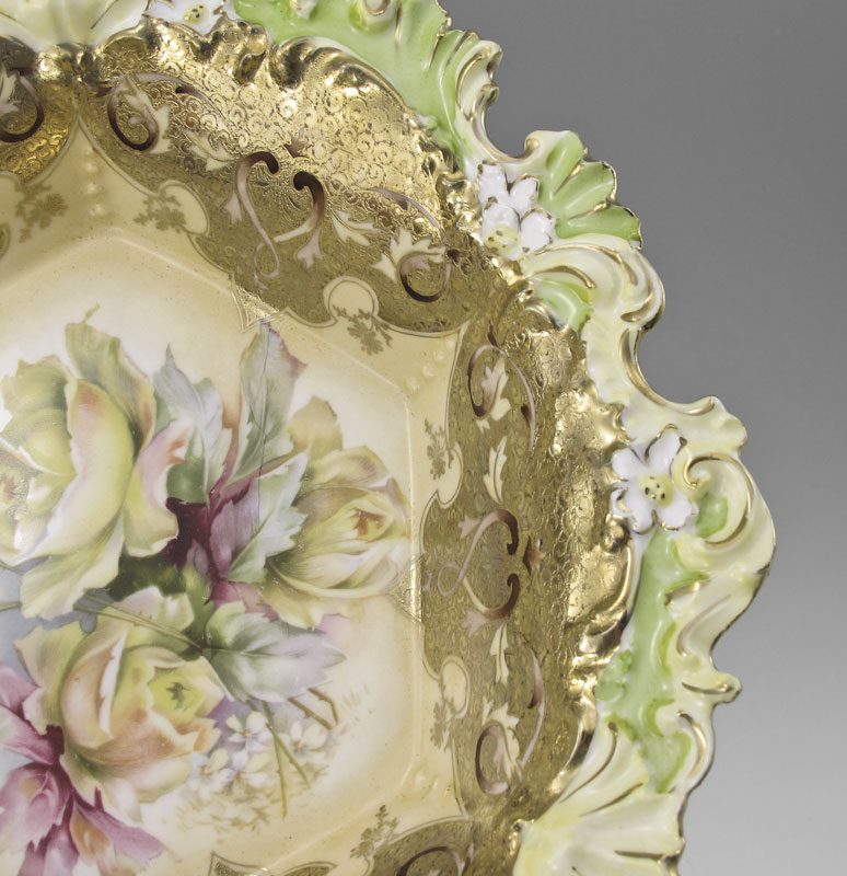 HAND PAINTED R S PRUSSIA SALAD BOWL: Hand painted floral design with gilt decoration on shaped bowl. Mold number R658. Unmarked. 2 5/8'' h. x 10 3/8''.