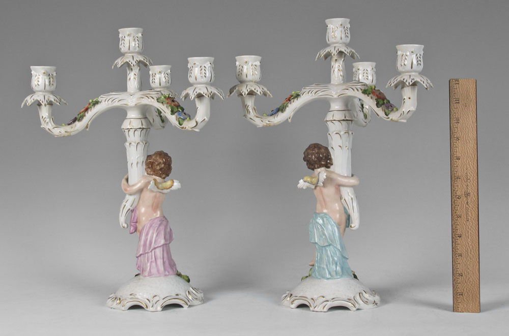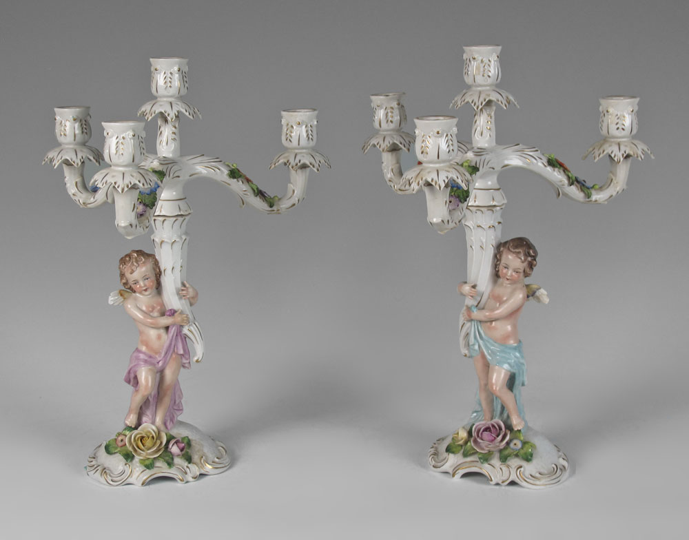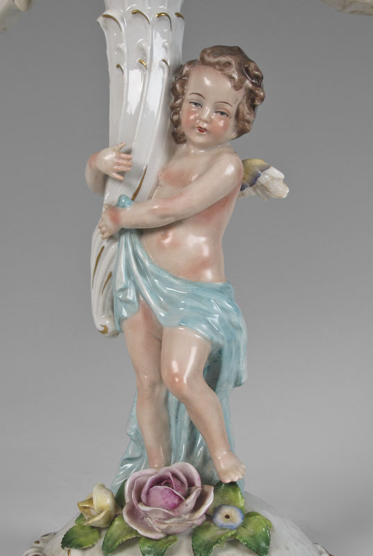 GERMAN DRESDEN PORCELAIN CANDELABRAS: Cherub figural stem supports 4 lights, 15 3/4'' tall. Crown N mark along with Germany.