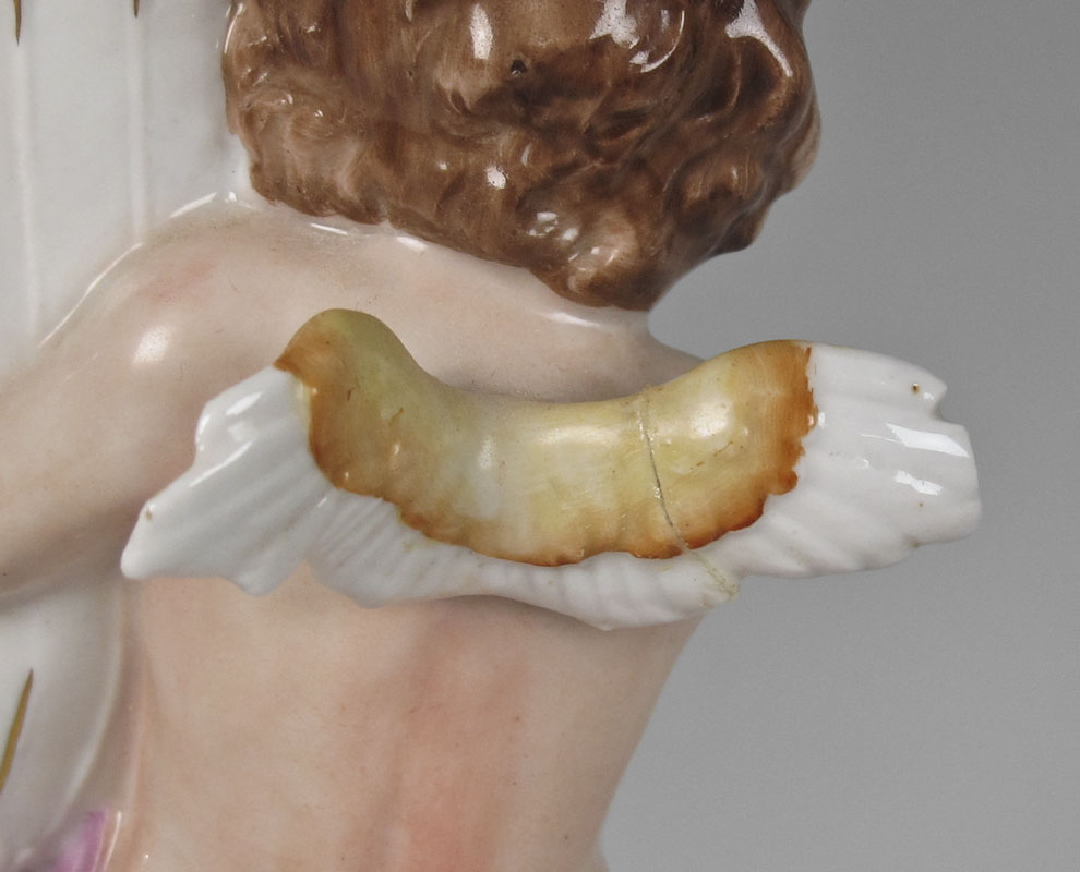 CONDITION: Note needs reattachment of one bobeche. Loss of a finger, repair to wing.