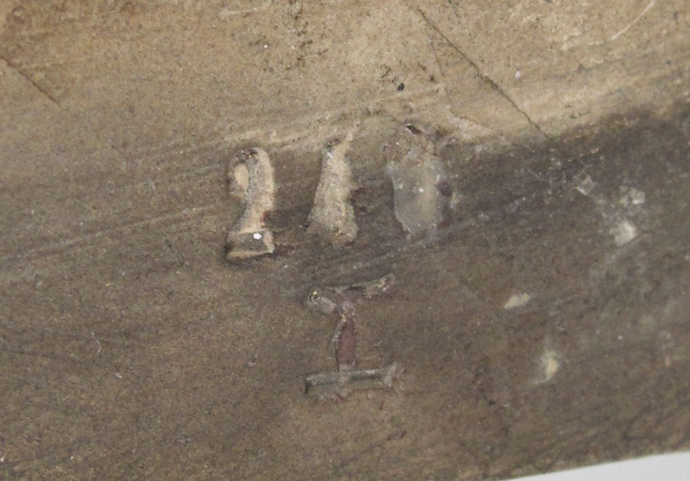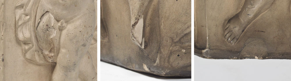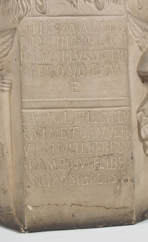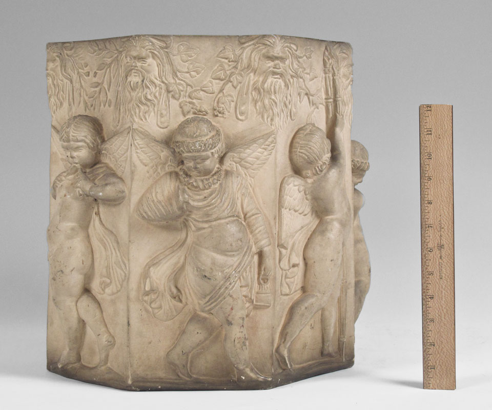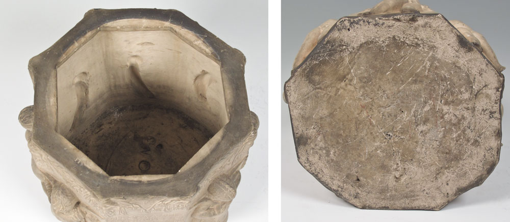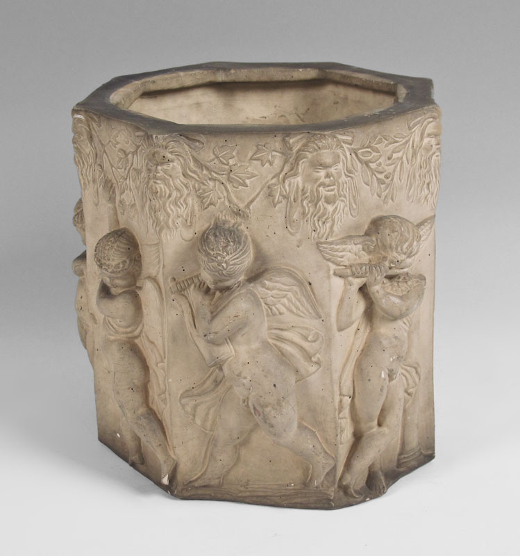 CHERUBIC POTTERY JARDINIER: Octagon form with figural cherubs and Latin writing. Marked 248? I on rim. 15 1/2'' h. x 16 1/2''.