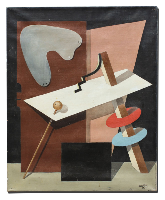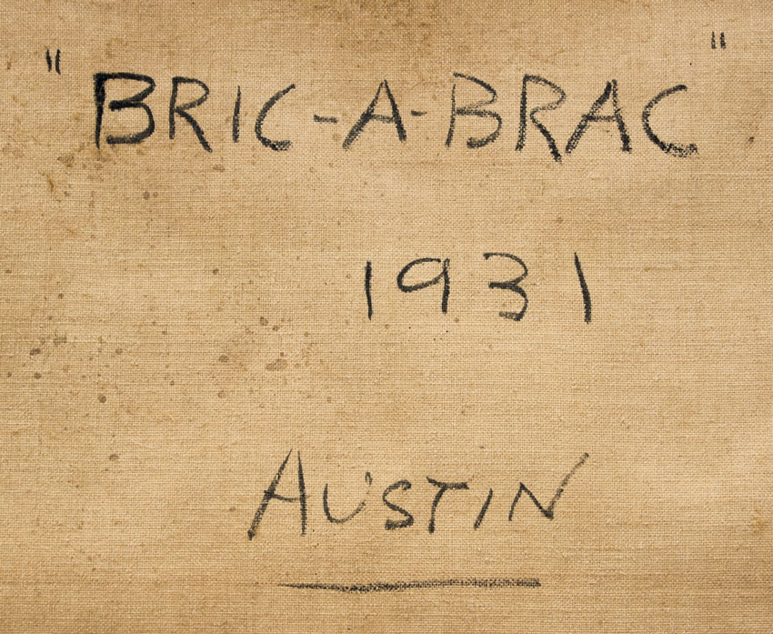 MODERNIST STILL LIFE COMPOSITION ''BRIC-A-BRAC'': OIL/Canvas, 20'' x 16'', signed lower right Austin, dated 1931, unframed, signed and titled verso.